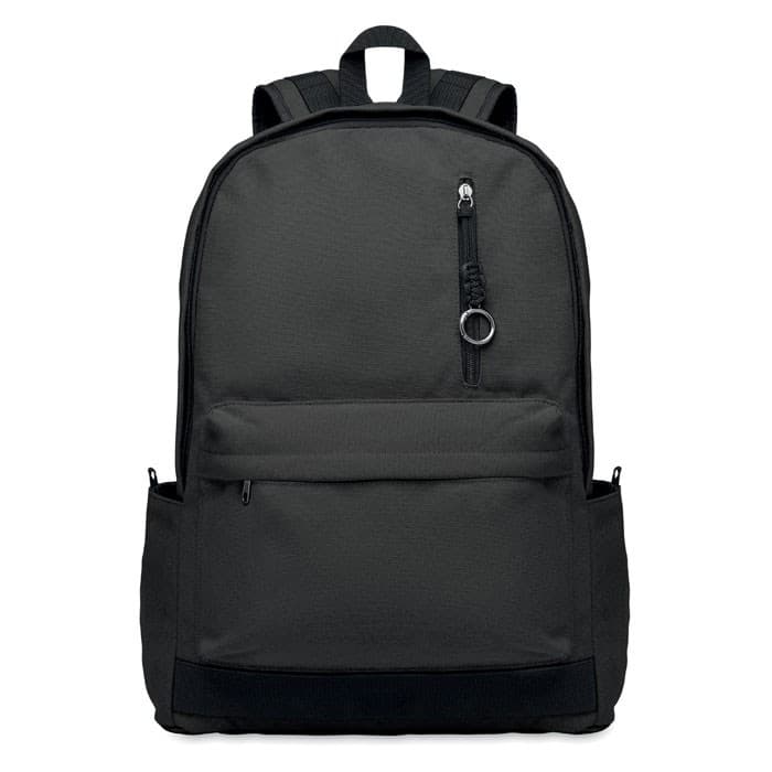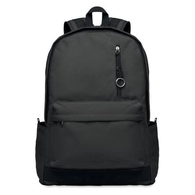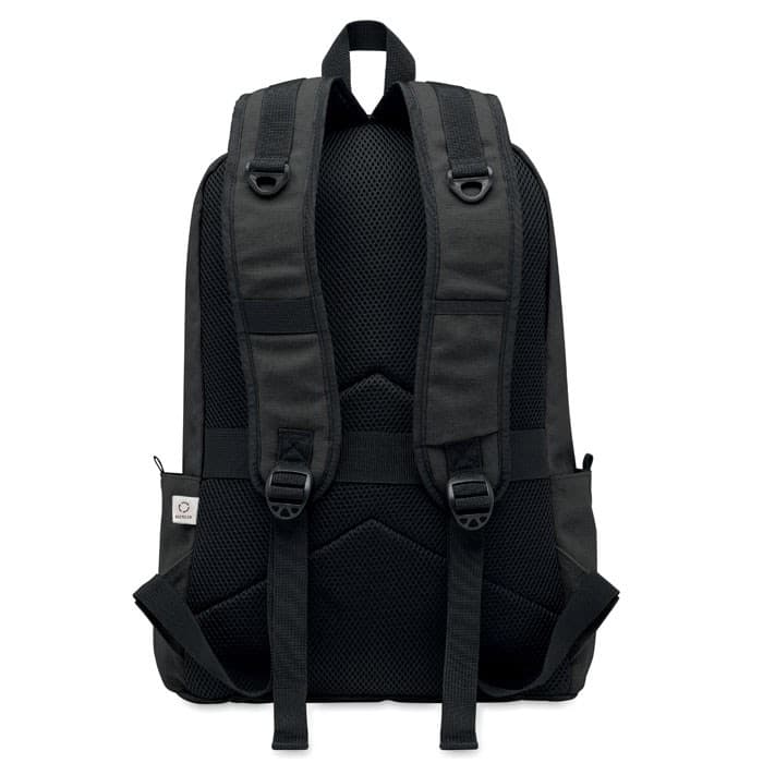 15 inch laptoprugzak van gerecycled pre-consumer katoen. Groot voorvak met rits en binnenvak voor laptop. Klein voorvak met rits. Twee zijvakken. Gewatteerde rug- en schouderbanden, rugpaneel en bodem. 450 gr/m².
