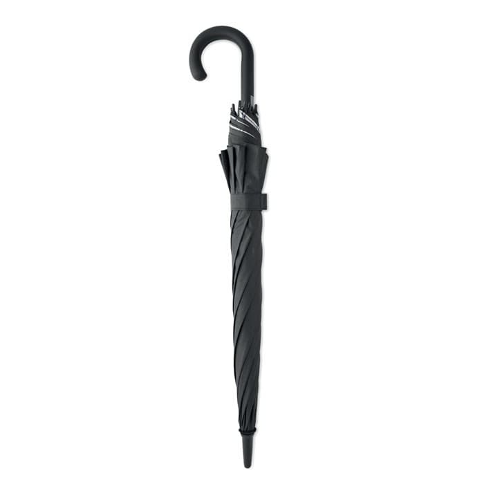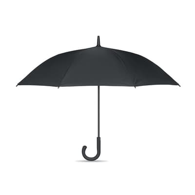 23 inch automatisch openende windbestendige paraplu in 190T pongee met geruit binnenpatroon. Fiberglas frame met zwart afgewerkte schacht en kunststof uiteinden. Gebogen handgreep met rubberen afwerking. Handmatige sluiting.