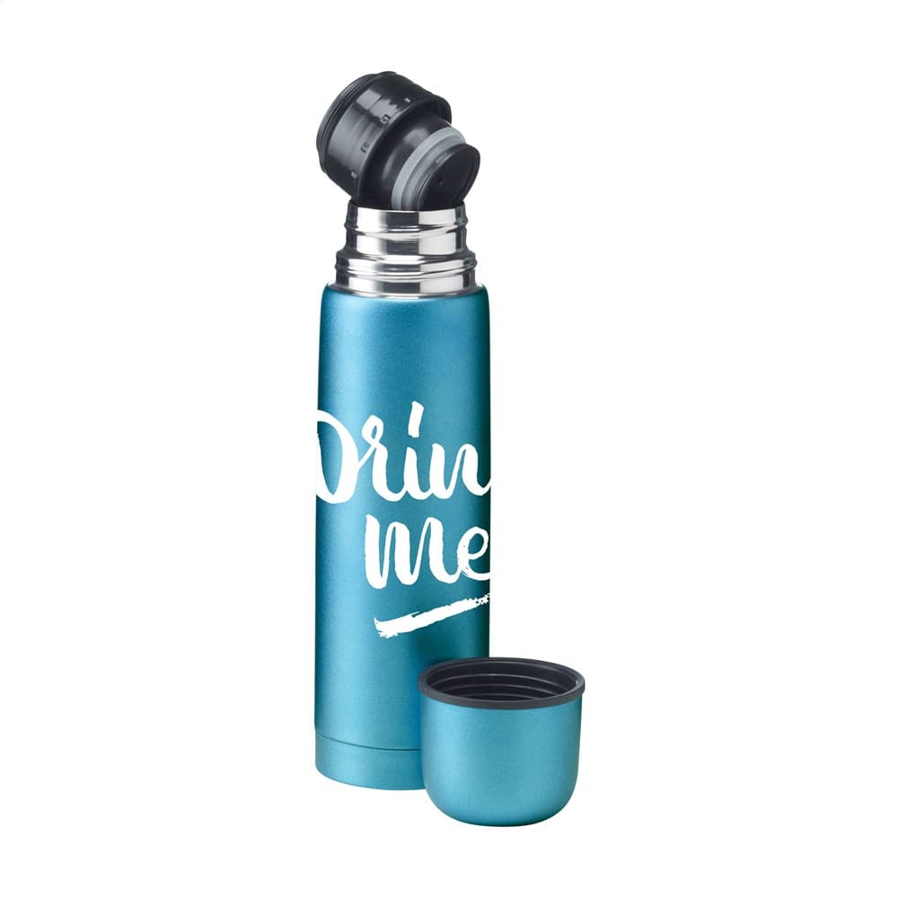 Deze dubbelwandige, vacuüm geïsoleerde RVS thermosfles is een praktische en stijlvolle toevoeging aan je drinkwaren. Met een dubbele schroefdop en een handig schenksysteem met druksluiting is deze fles volledig lekvrij. De dop dient tevens als drinkbeker, wat extra gemak biedt.