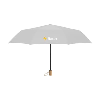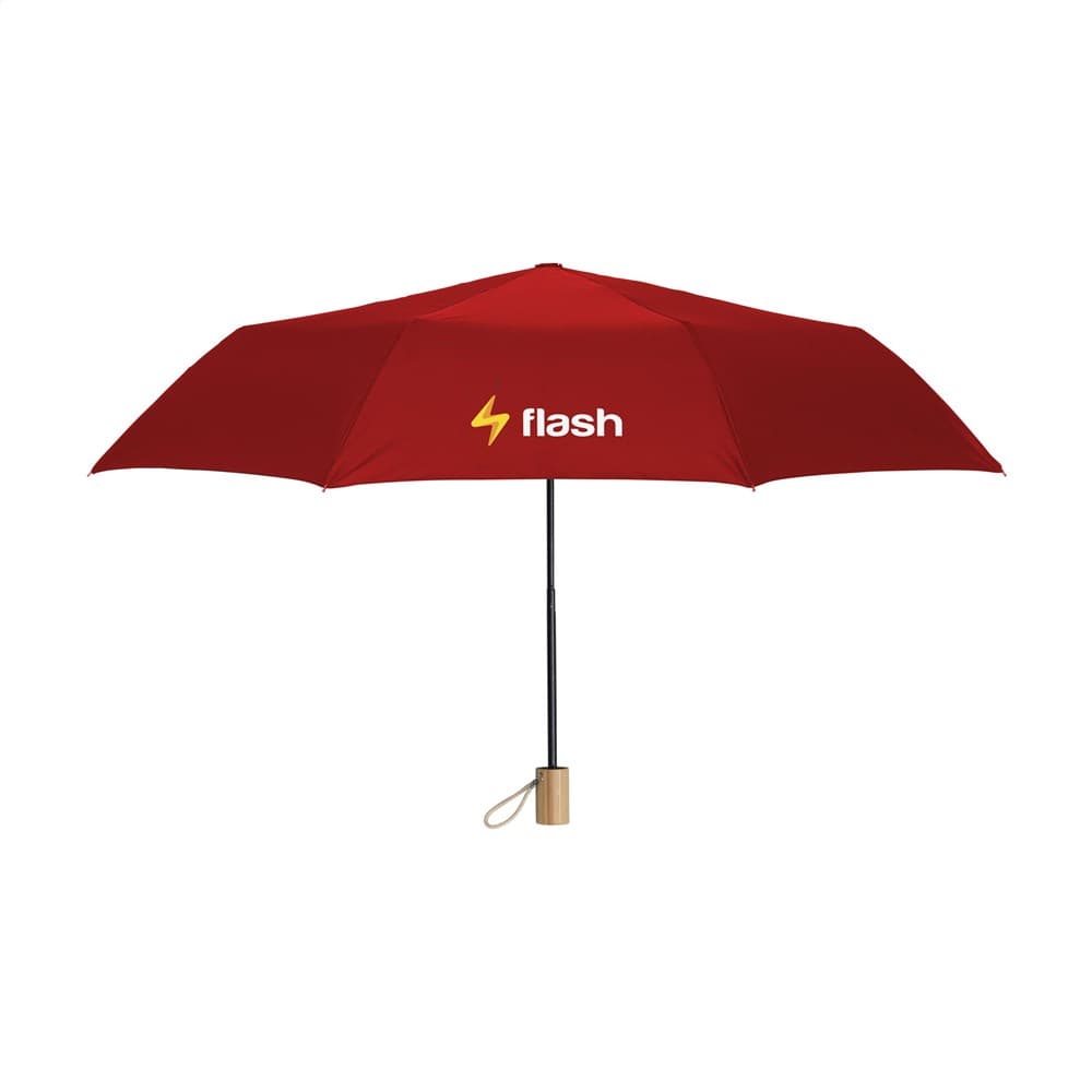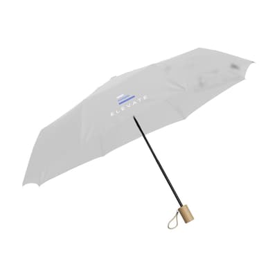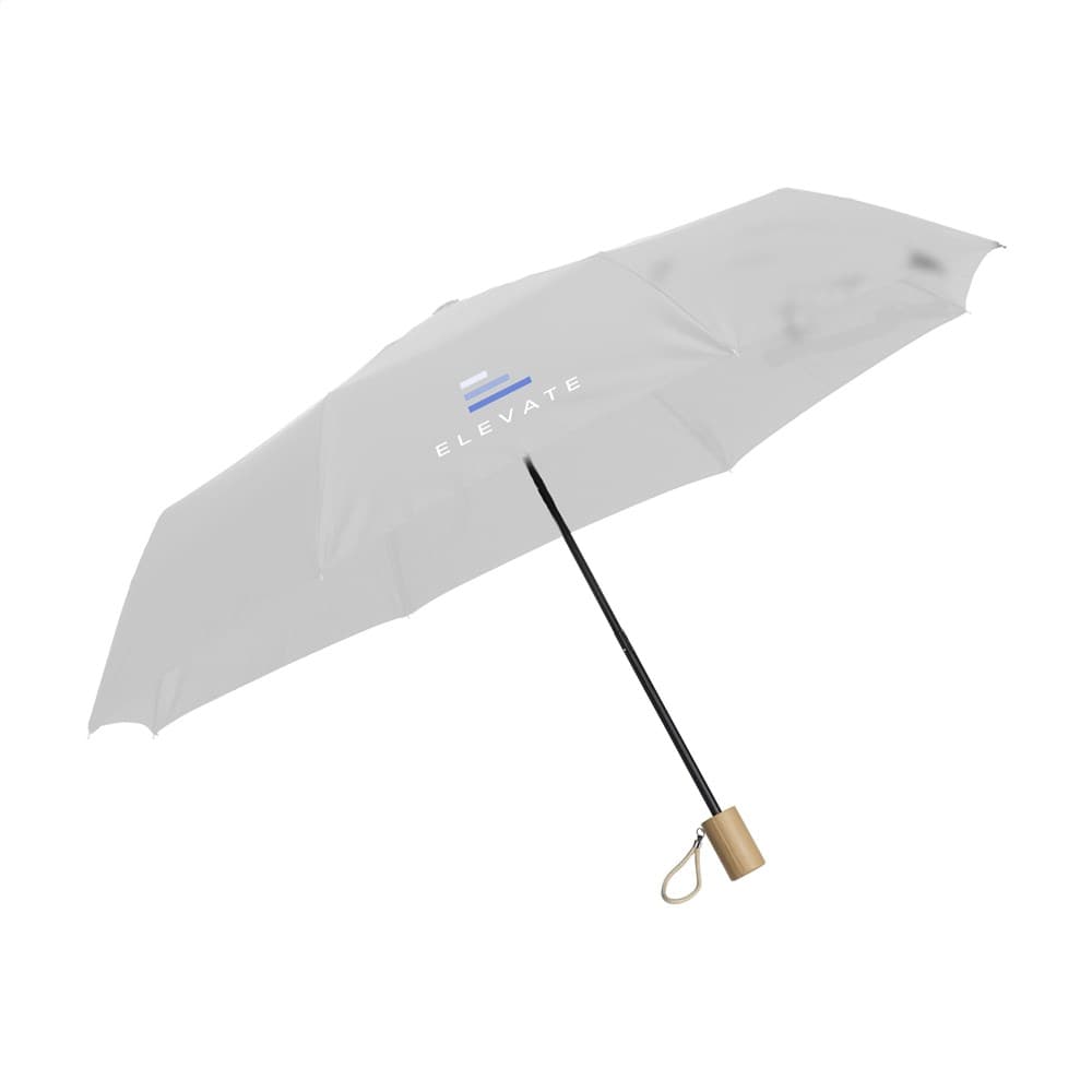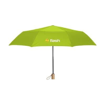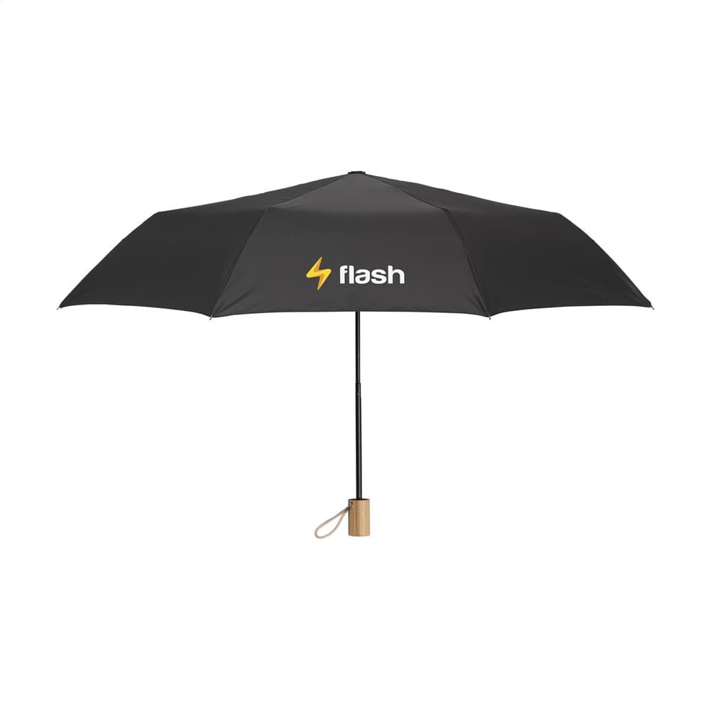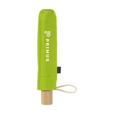 WoW! Opvouwbare paraplu gemaakt van 190T RPET pongee polyester, gerecycled van PET-flessen. Voorzien van een RVS frame en steel, een stijlvolle bamboe handgreep met katoenen lus, klittenbandsluiting en opberghoes met RPET-label. Deze paraplu heeft een manuele bediening en is perfect voor paraplu's bedrukken om een duurzame en persoonlijke touch toe te voegen.