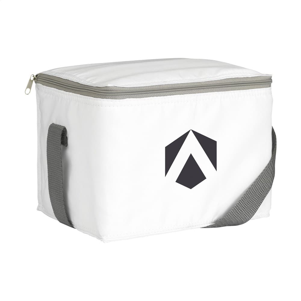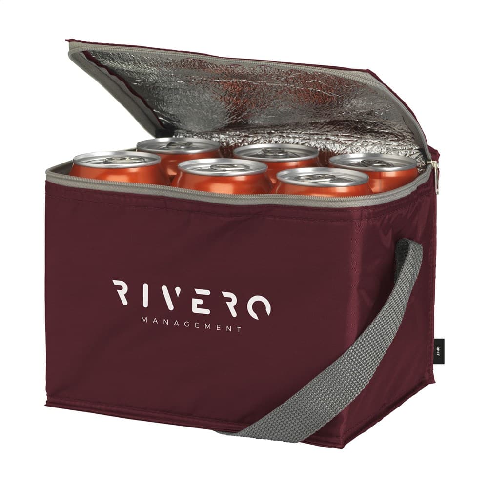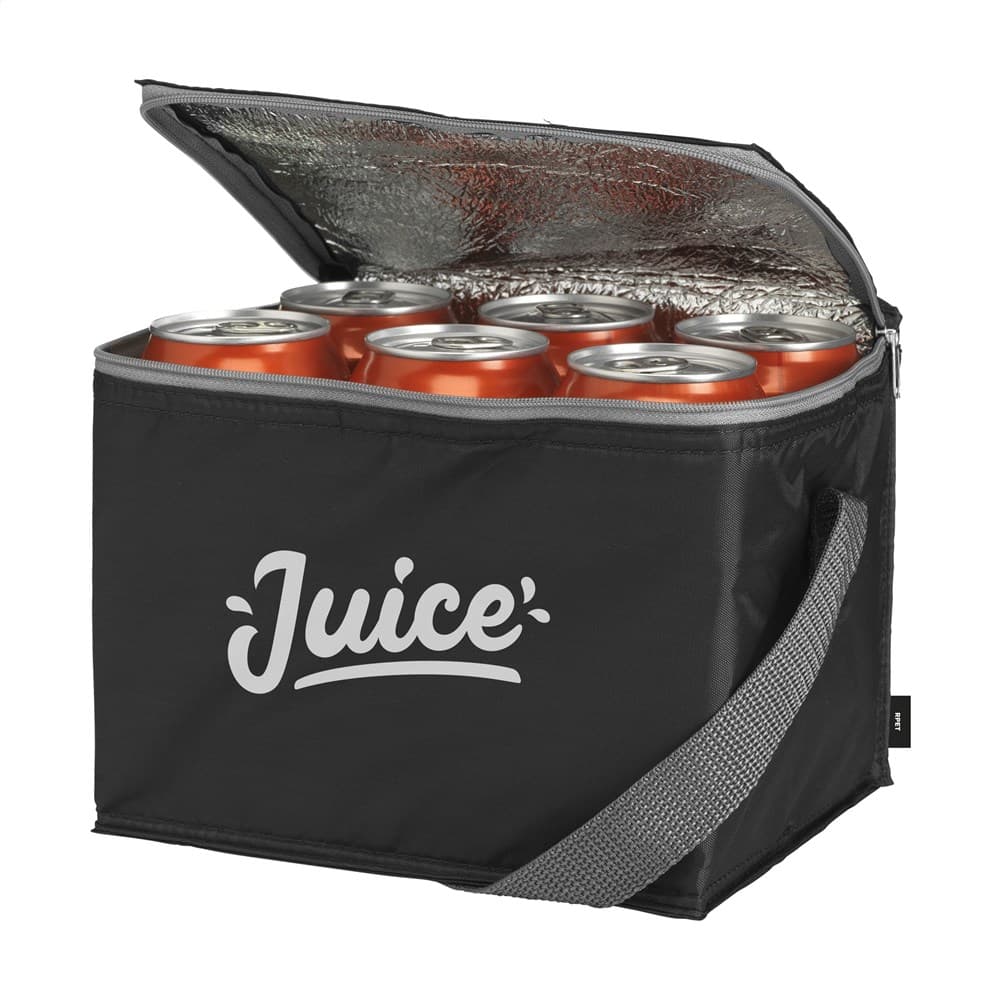 WoW! Koeltasje van 210D RPET polyester: gemaakt van gerecyclede PET-flessen. Geschikt voor 6 blikjes drank. Met draagriem. Inhoud ca. 3,5 liter.