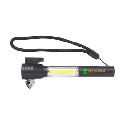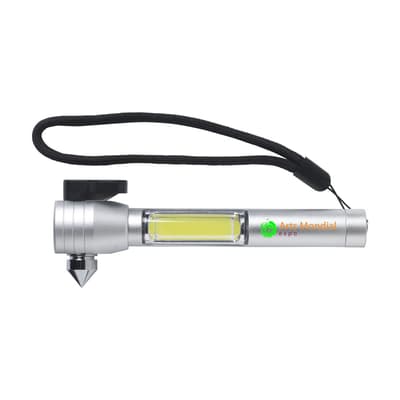 4-in-1 aluminium autotool met: veiligheidshamer, gordelsnijder, magneet en zaklamp met COB-licht. Een noodgereedschap dat in elke auto binnen handbereik zou moeten zijn. Inclusief afneembare polslus en batterijen.