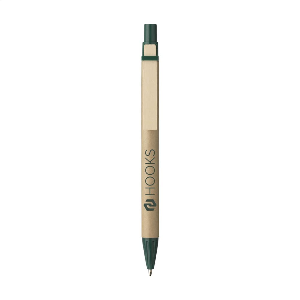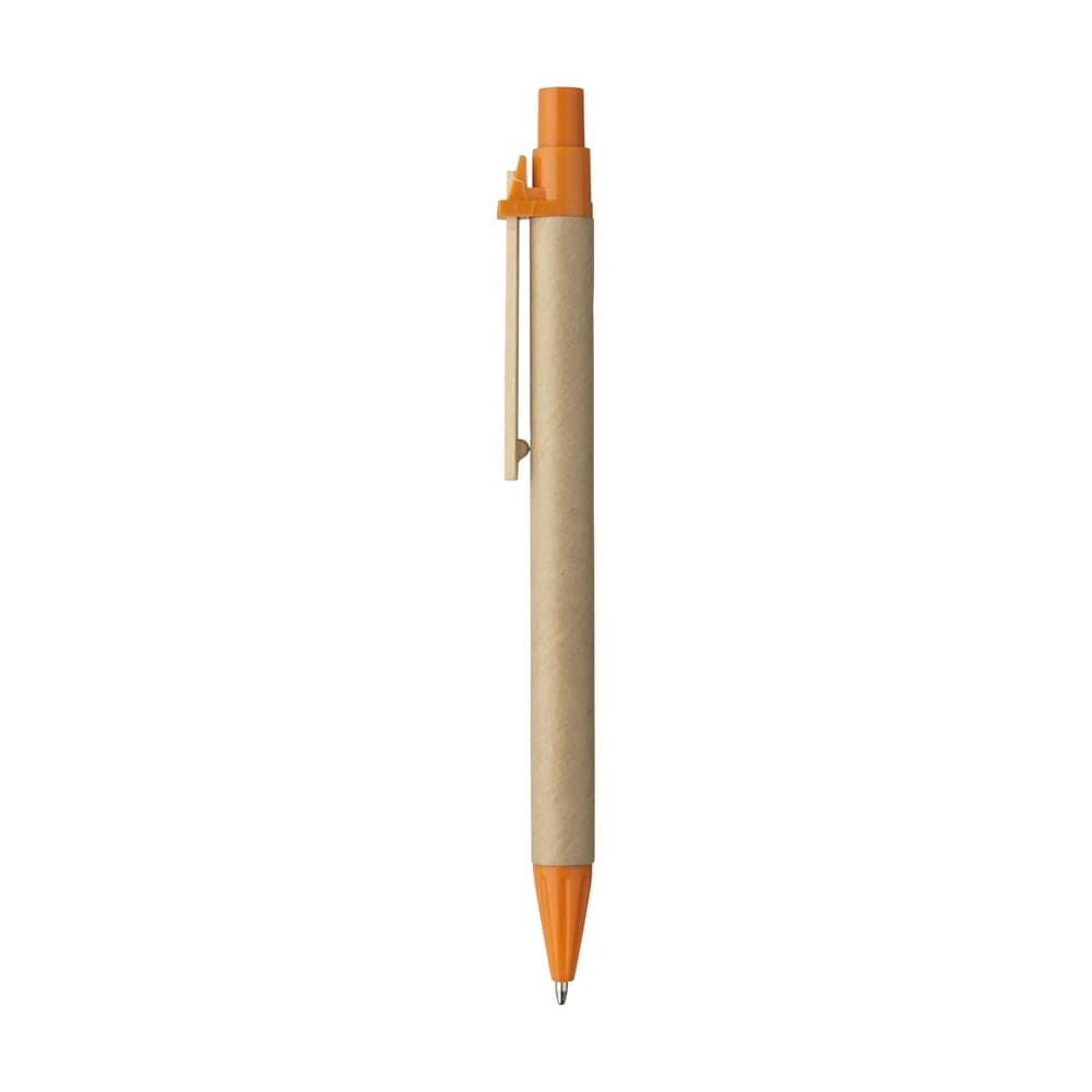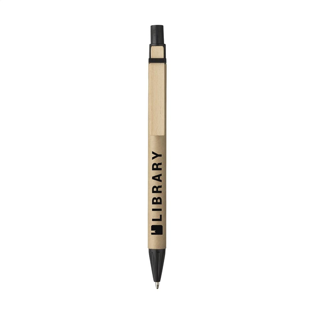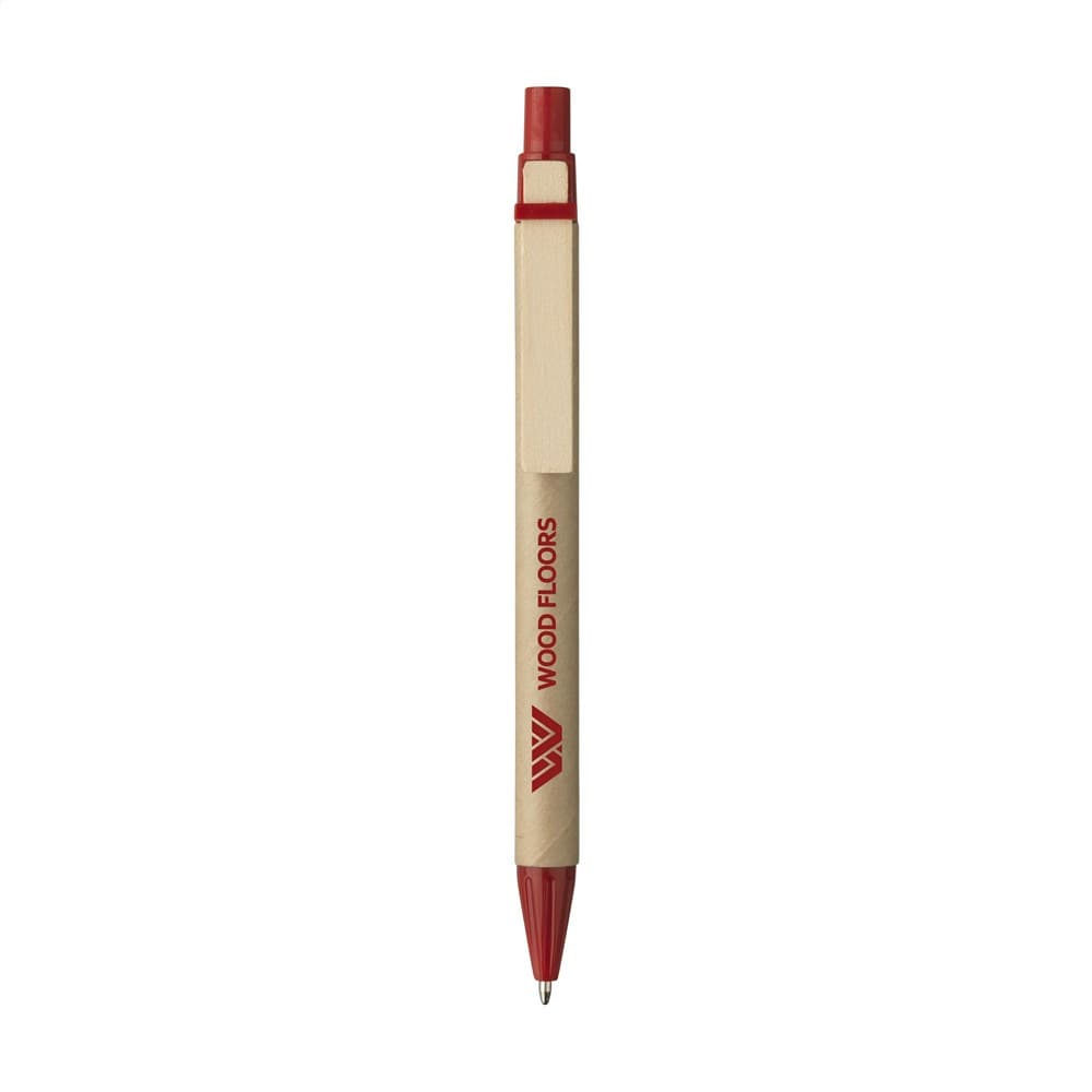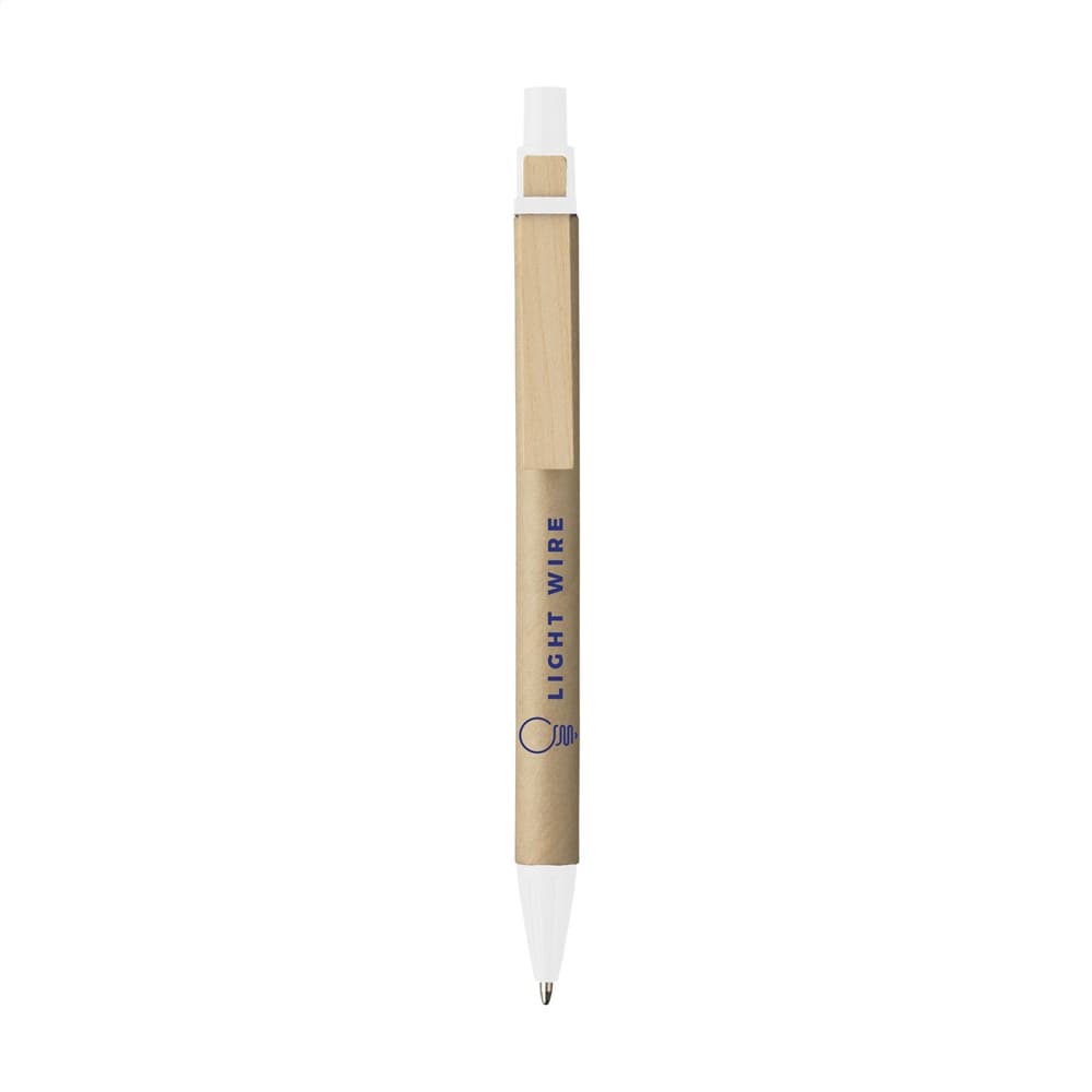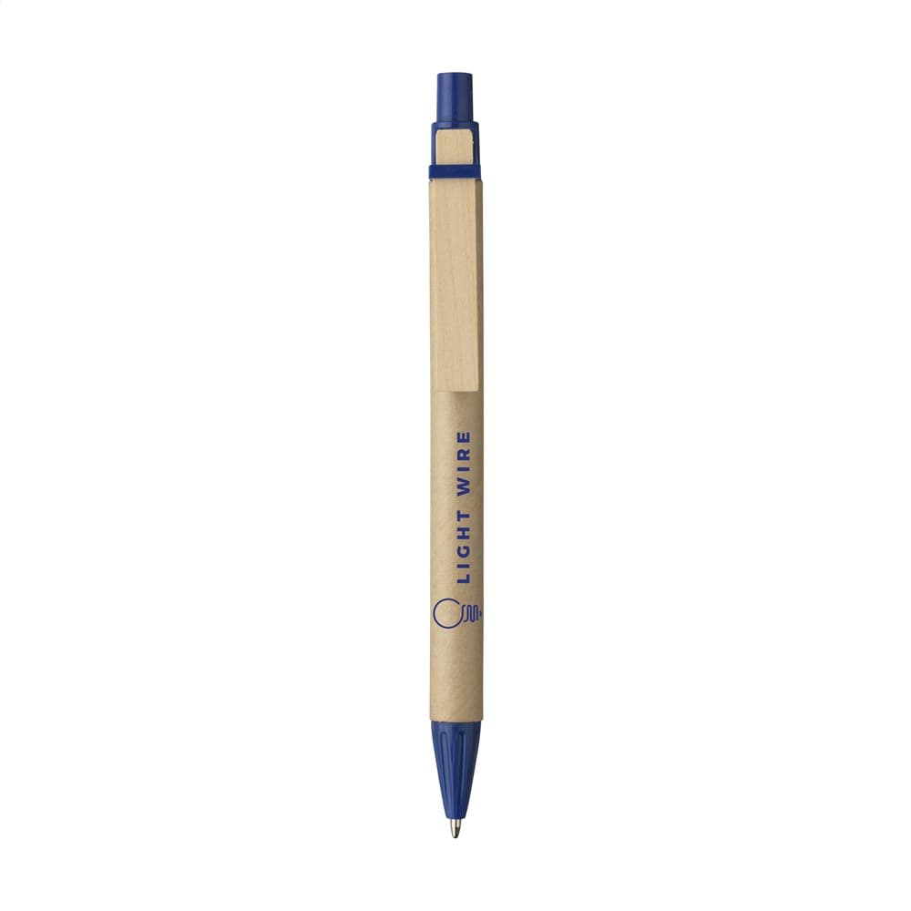 WoW! Blauwschrijvende balpen met houder van gerecycled karton, houten clip en gekleurde kunststof accenten.