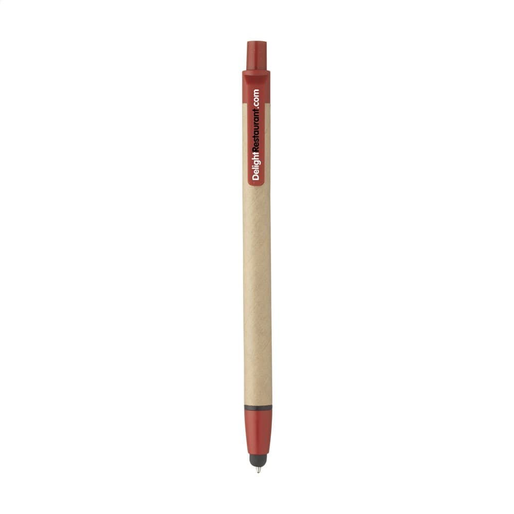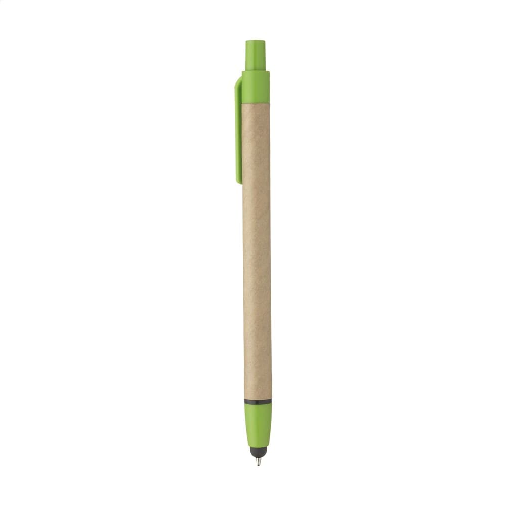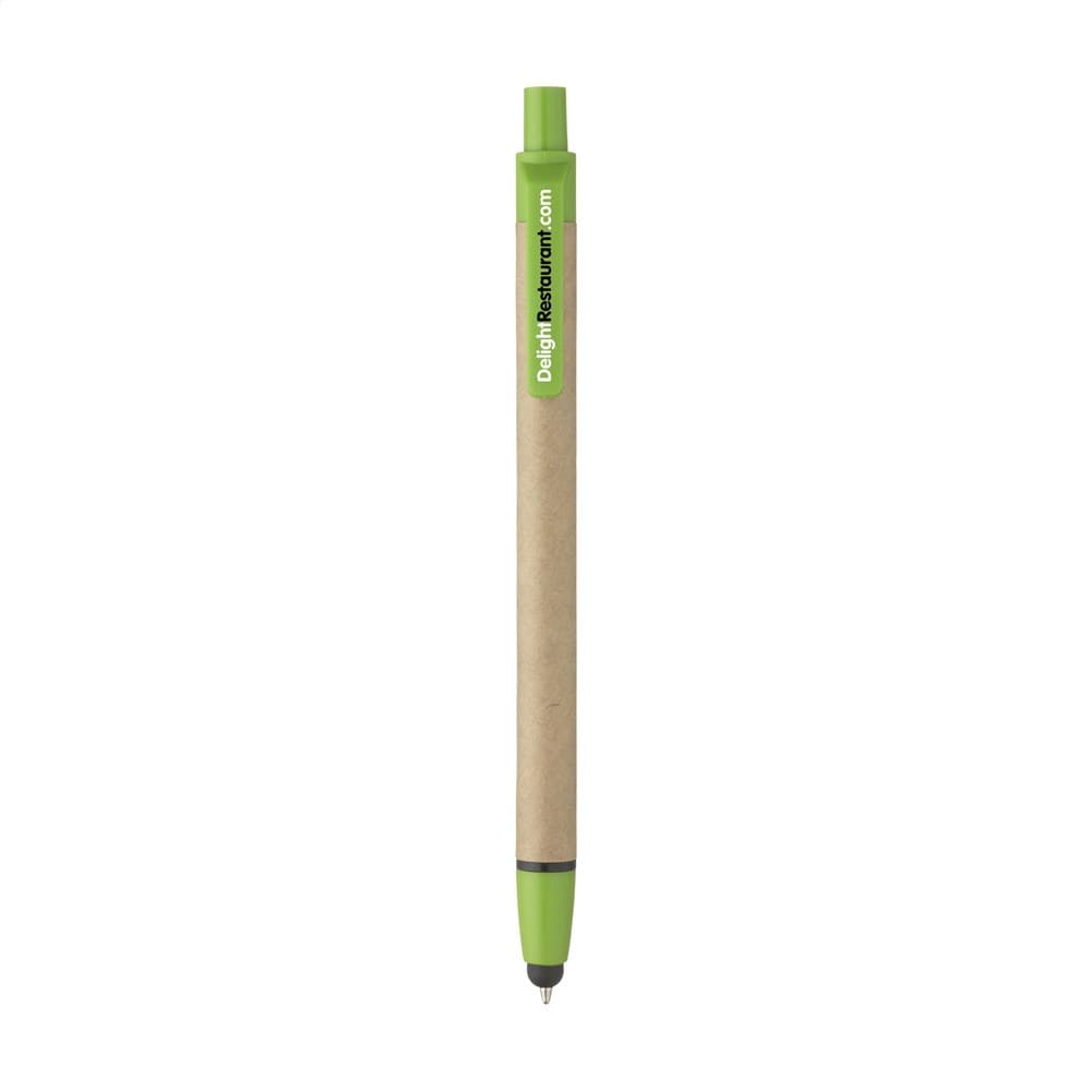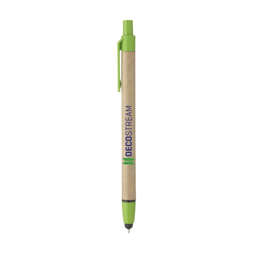 WoW! Blauwschrijvende balpen met houder van gerecycled karton, rubberen pointer voor het bedienen van touchscreens en kunststof accenten.