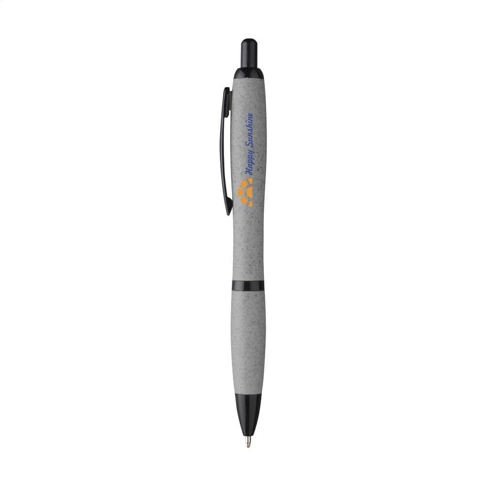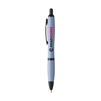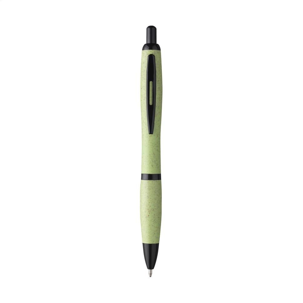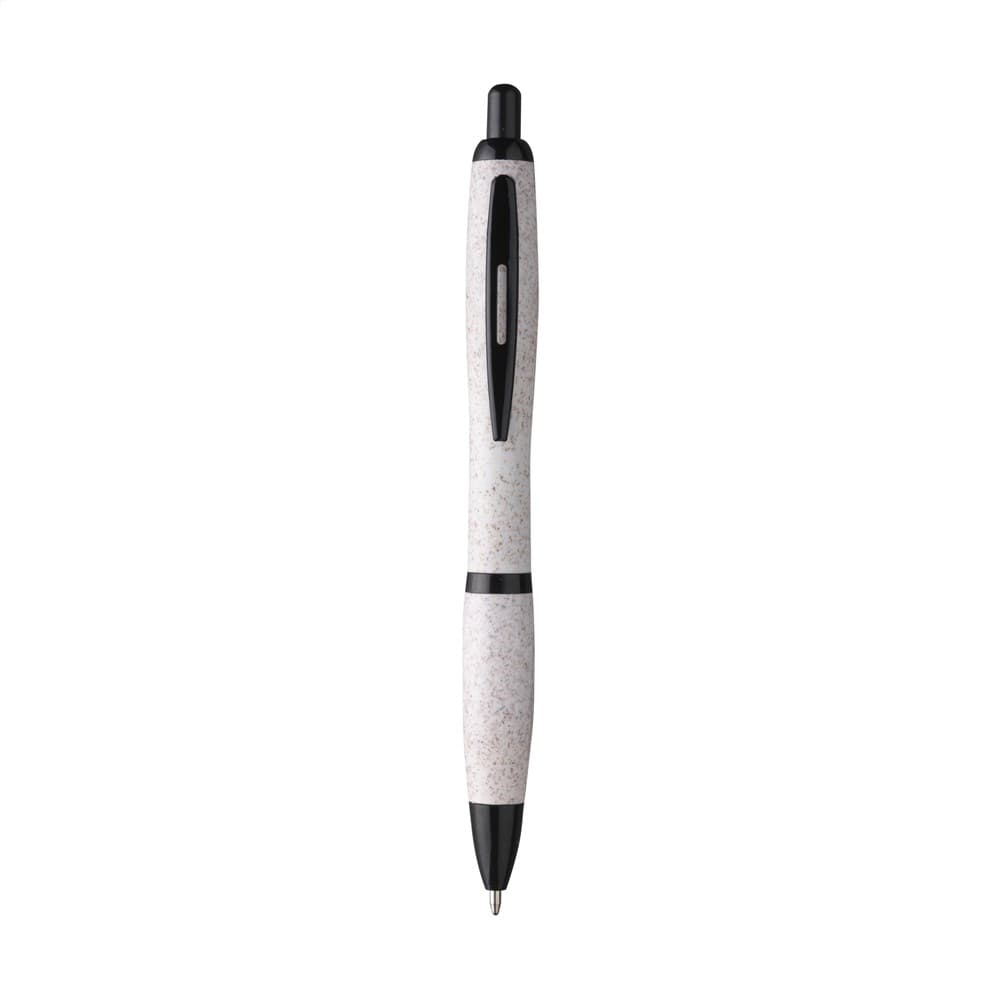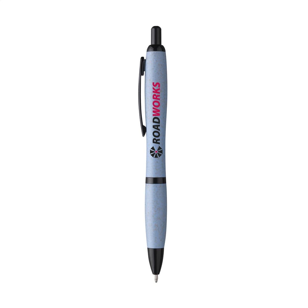 Eco-vriendelijke, blauwschrijvende balpen gemaakt van 50% PP en 50% tarwestro. Voorzien van zwarte accenten en metalen clip. Gedeeltelijk biologisch afbreekbaar.