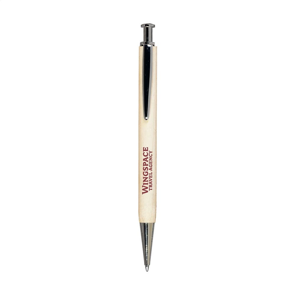 WoW! Blauwschrijvende balpen van massief beukenhout. Met verchroomde clip, drukknop, puntstuk.