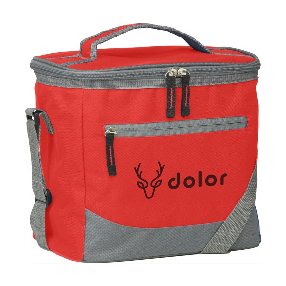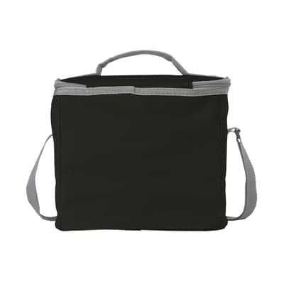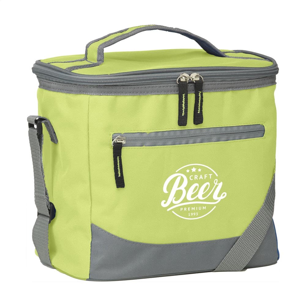 Handig formaat koeltas van geweven 600D polyester. Met ruim koelvak, ritsvak aan de voorzijde, handgreep en verstelbare schouderriem. Geschikt voor 12 blikjes drank.