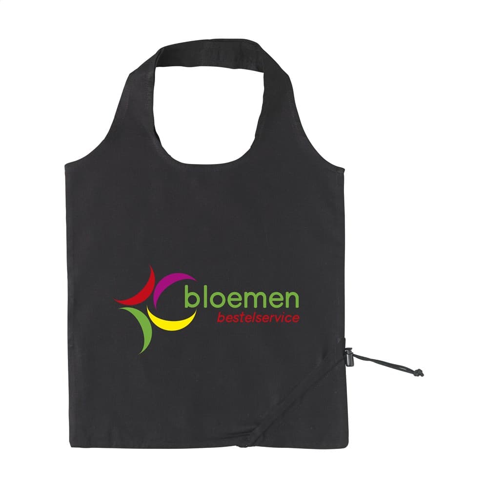 Opvouwbare, royale winkeltas van 100% stevig katoen (135 g/m²) met dubbele draaglus. In een handomdraai van pouch naar tas. Afm. uitgevouwen 56 x 37,5 cm.