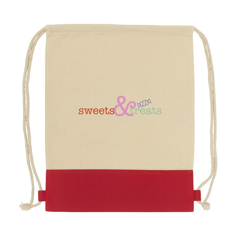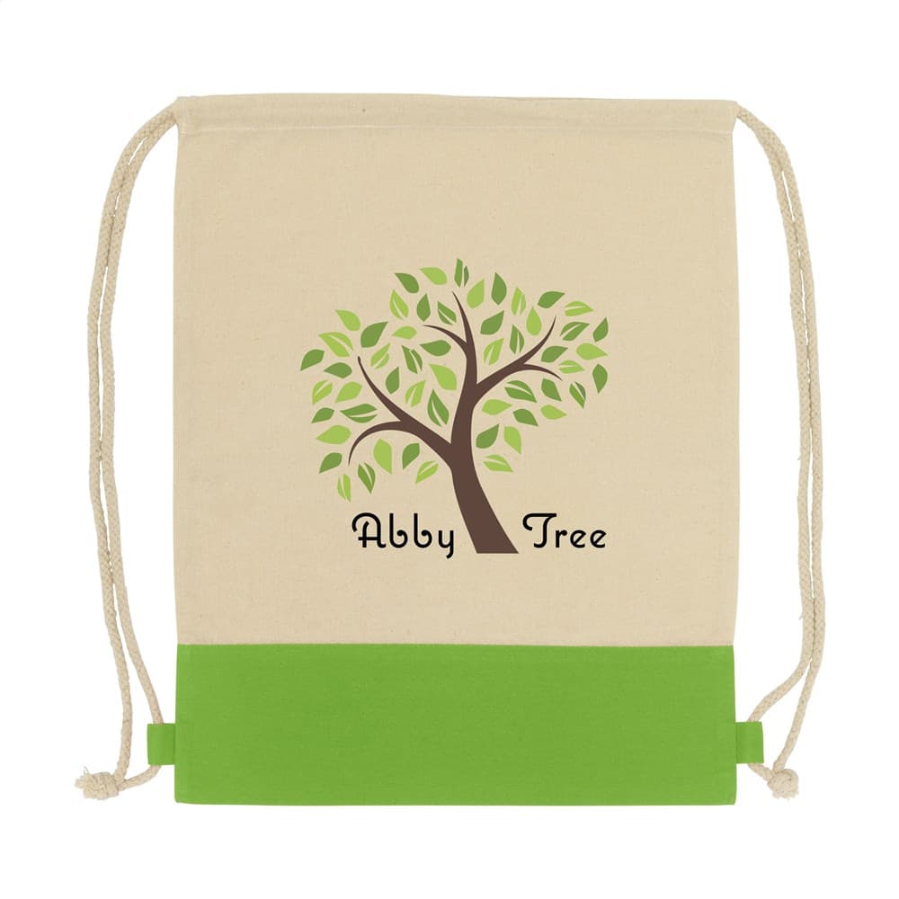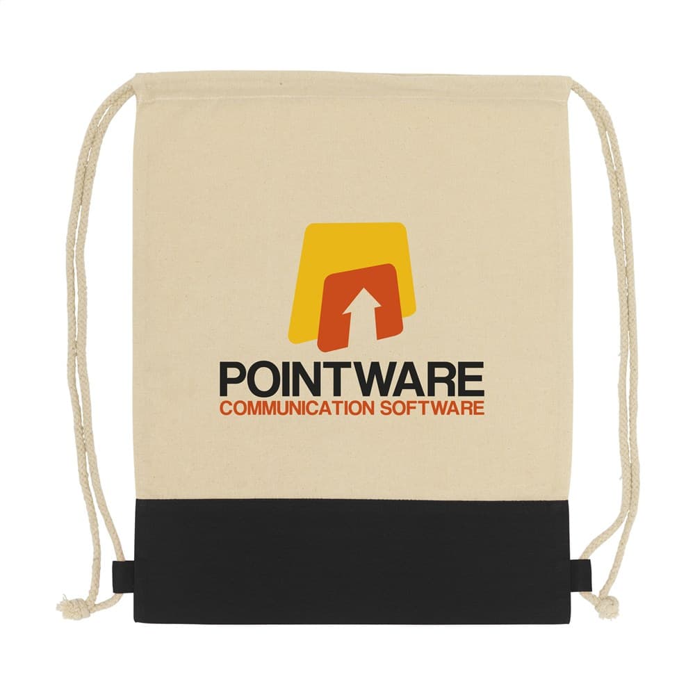 Rugzak met aanrijgkoorden van 100% katoen (125 g/m²) en een inzet in kleur. Inhoud ca. 8 liter.