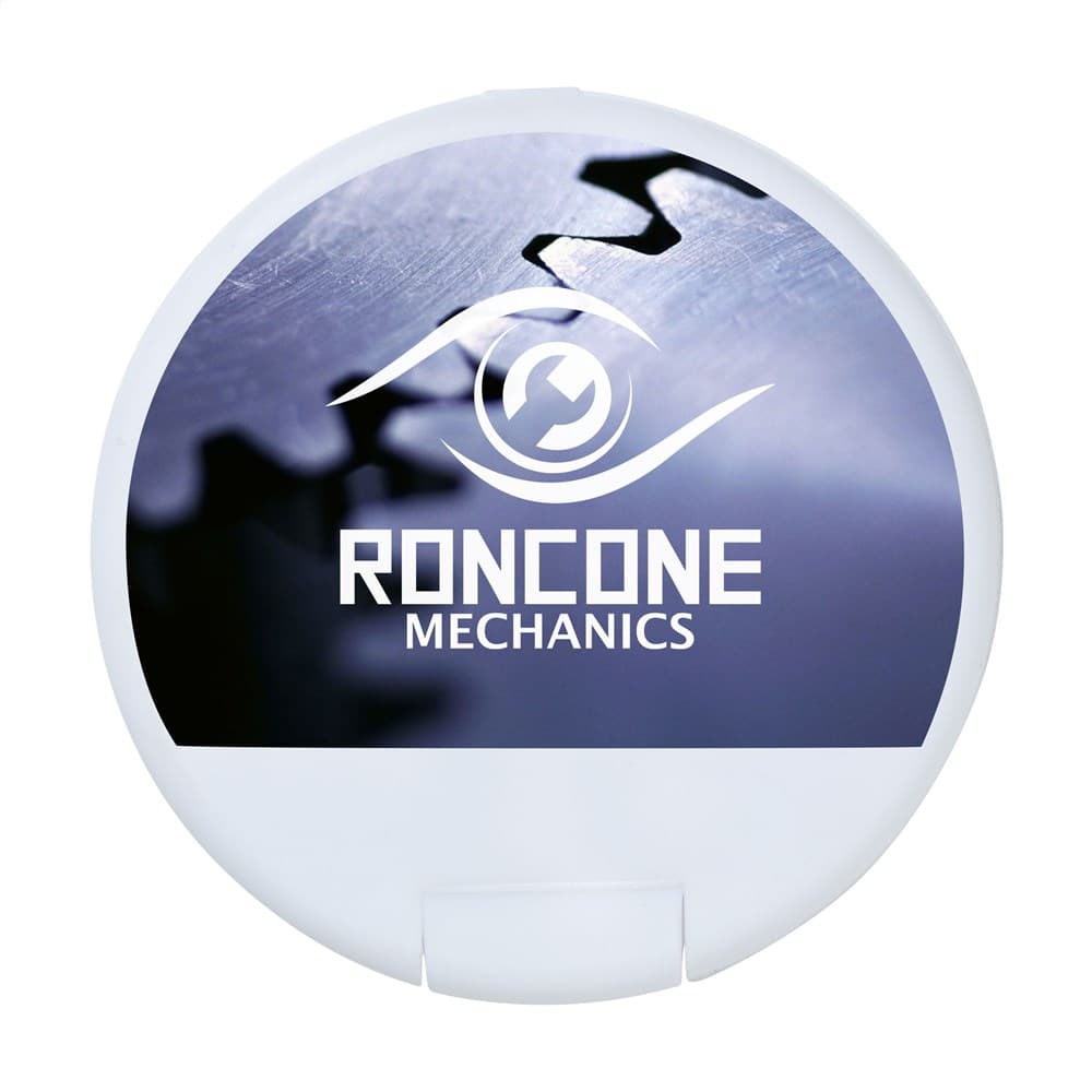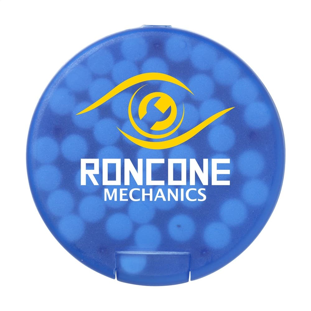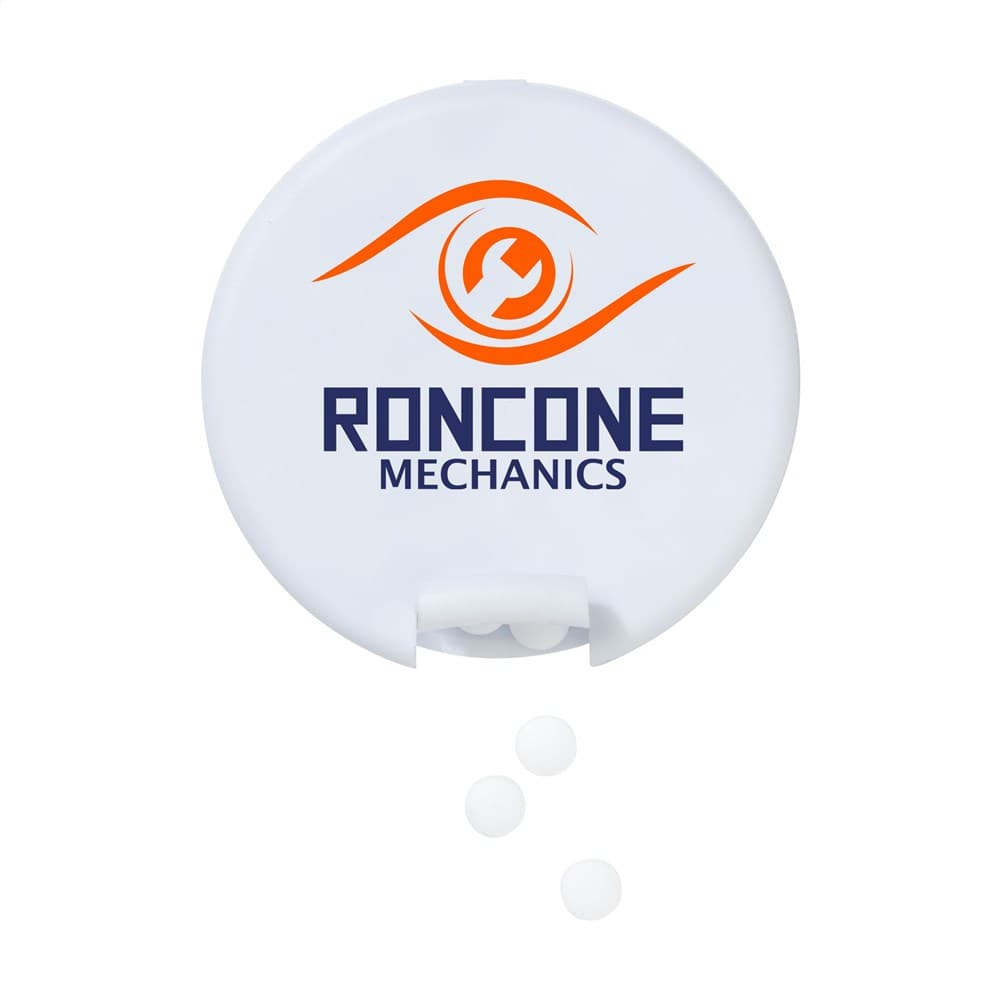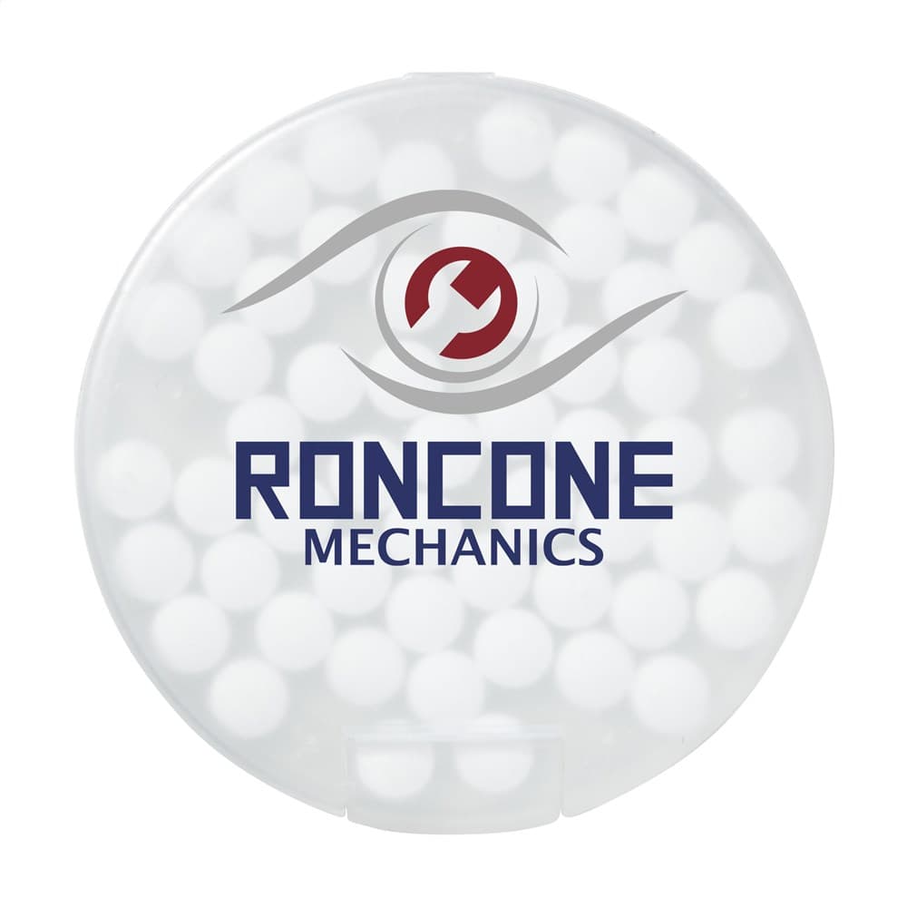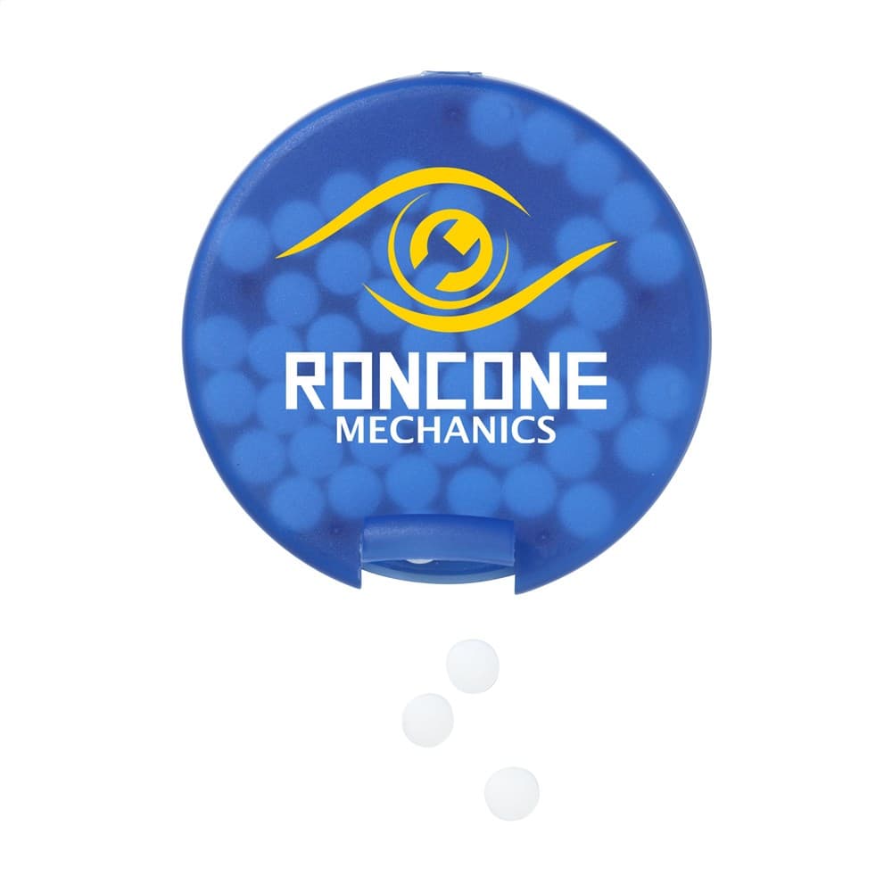 Ronde, kunststof dispenser gevuld met ca. 12 gram (ca. 55 stuks) frisse, suikervrije pepermuntjes.