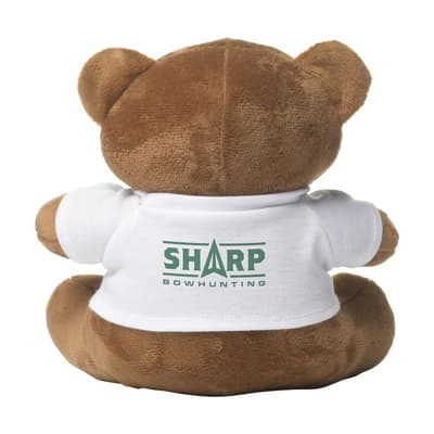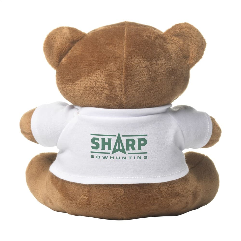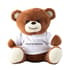 Donkerbruine, superzachte knuffelbeer met kraalogen, verharde neus en wit T-shirt. Zonder opdruk worden de beren en T-shirts los geleverd.