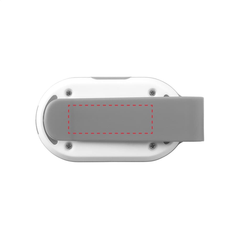 Reflectorlampje met gekleurde bevestigingsclip. Twee lichtstanden: helwit continu licht of rood knipperlicht. Incl. celbatterijen.