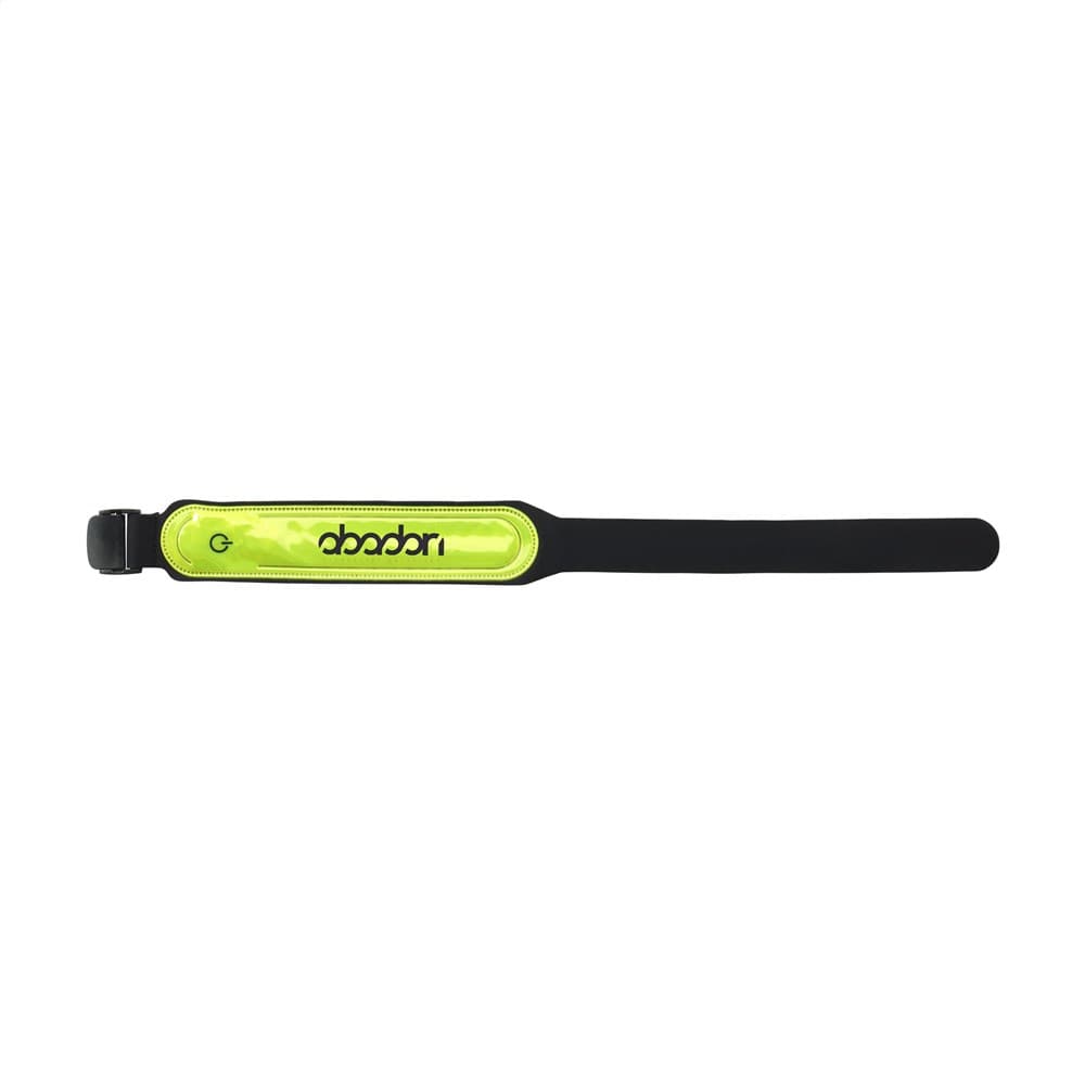 Goed zichtbaar met deze verstelbare, elastische armband met fluoriserende strip en rood LED-licht. In te stellen op 3 standen: snel knipperend, langzaam knipperend of continu licht. Met handige, kunststof sluiting. Incl. batterij.
