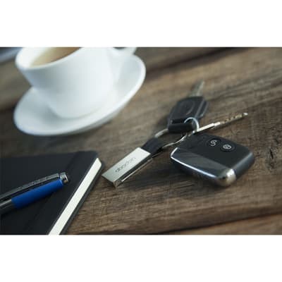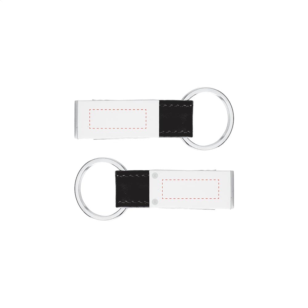 Metalen sleutelhanger in combinatie met zwart PU lederlook materiaal. Aan stevige sleutelring. Per stuk in doosje.
