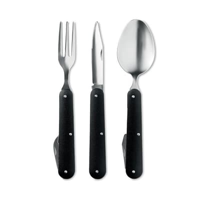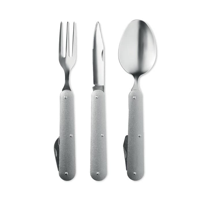 Opvouwbaar roestvrijstalen kampeerbestek met aluminium handvat. Mes, vork en lepel.