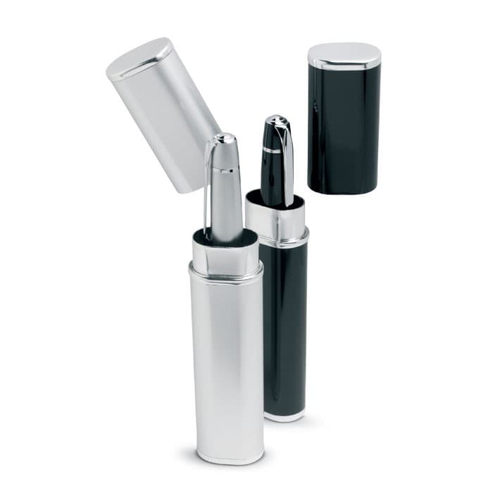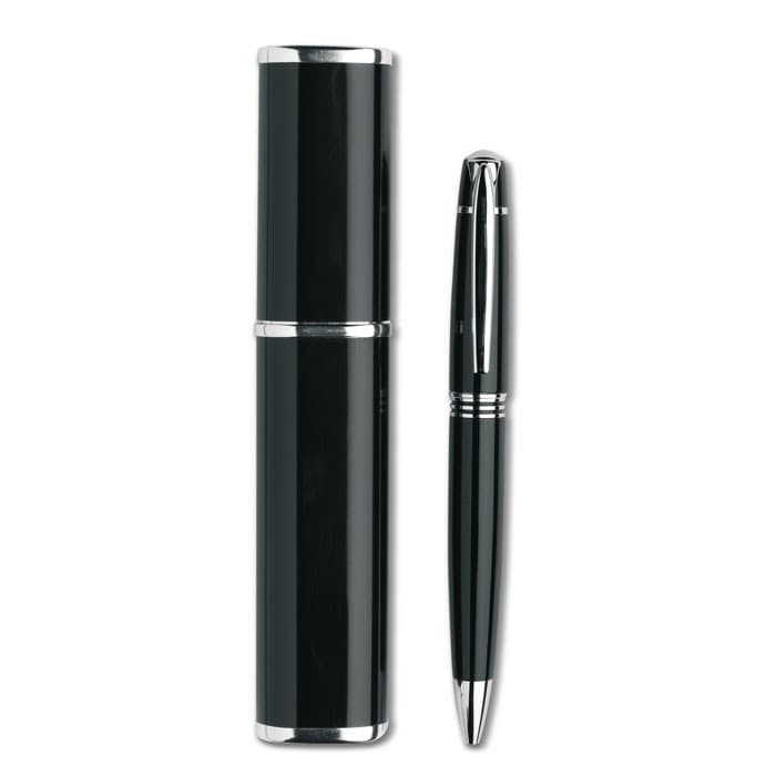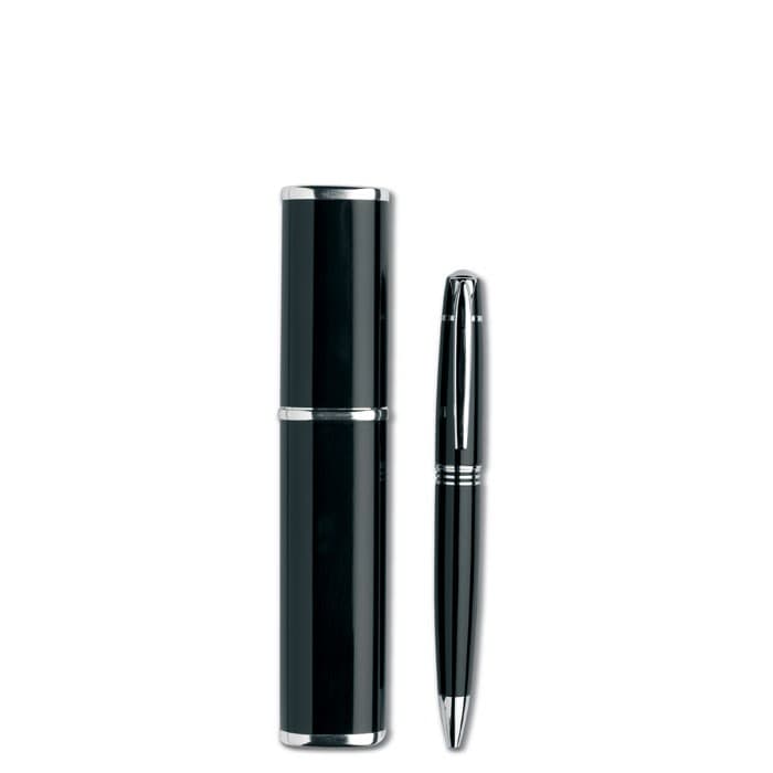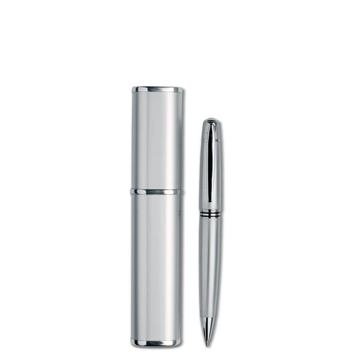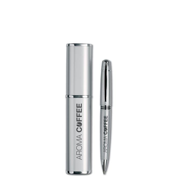 Metalen balpen met draaimechanisme in een aluminium geschenkverpakking. Geleverd met zwarte inkt.