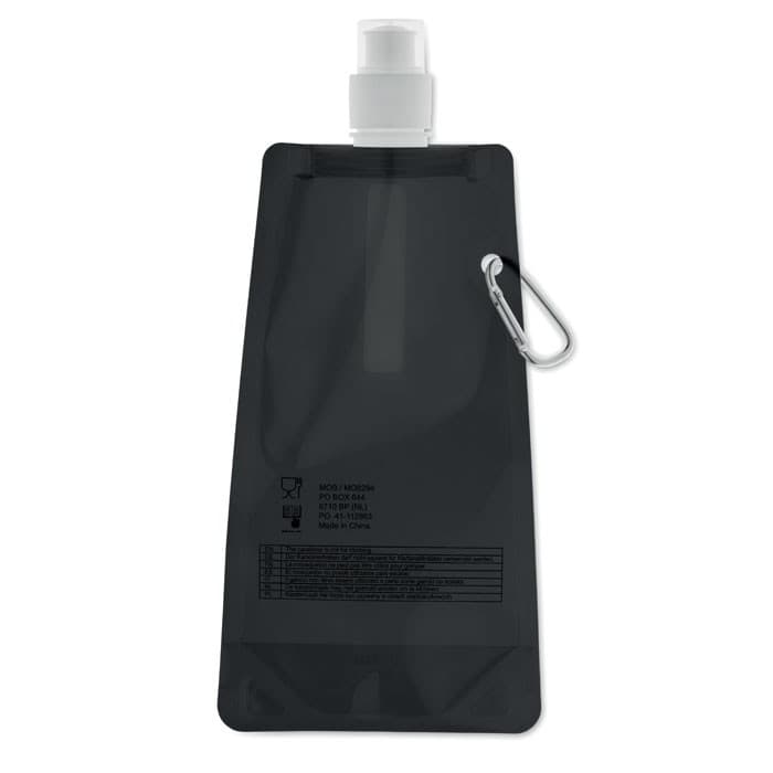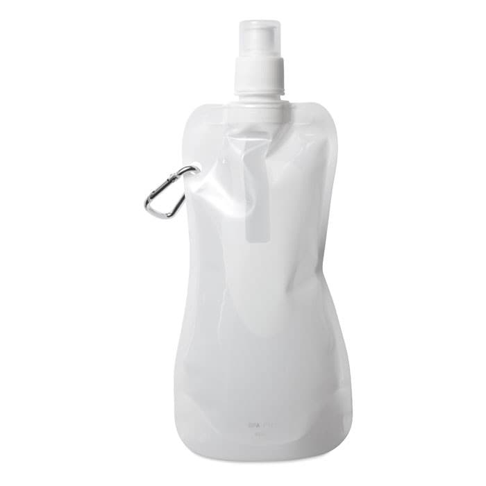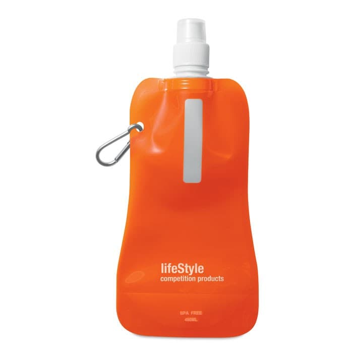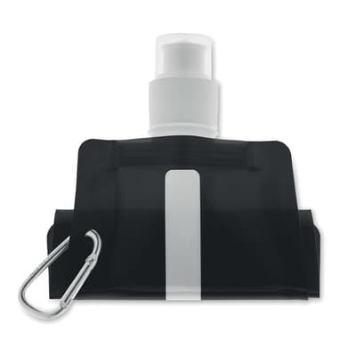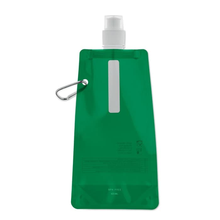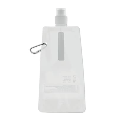 Opvouwbare PET drinkfles van BPA vrij kunststof met aluminium karabijnhaak. Inhoud 480 ml. Lekvrij.