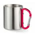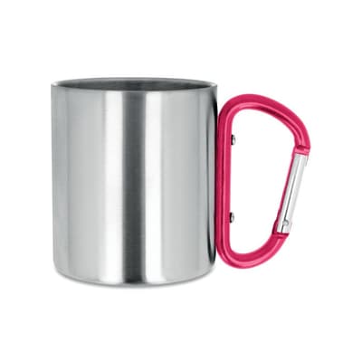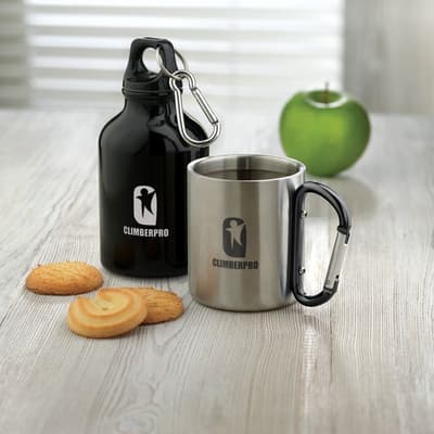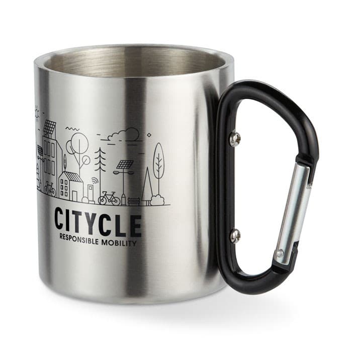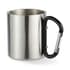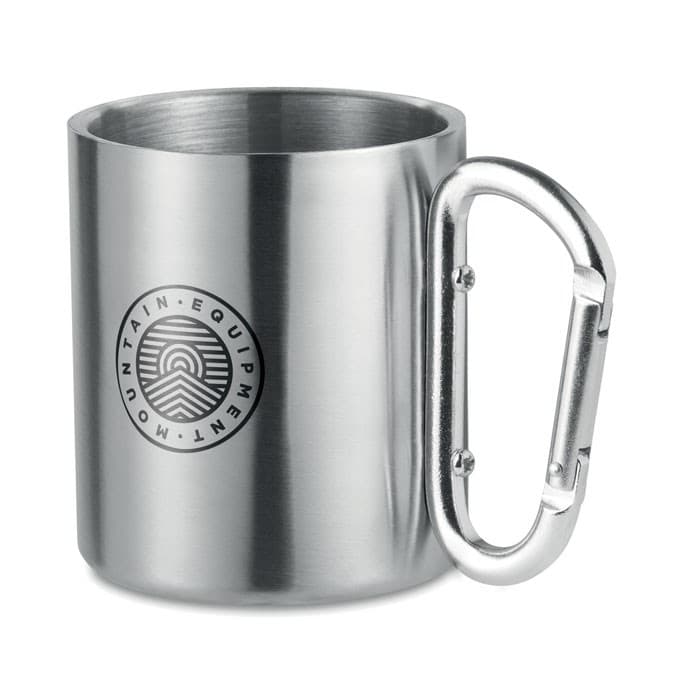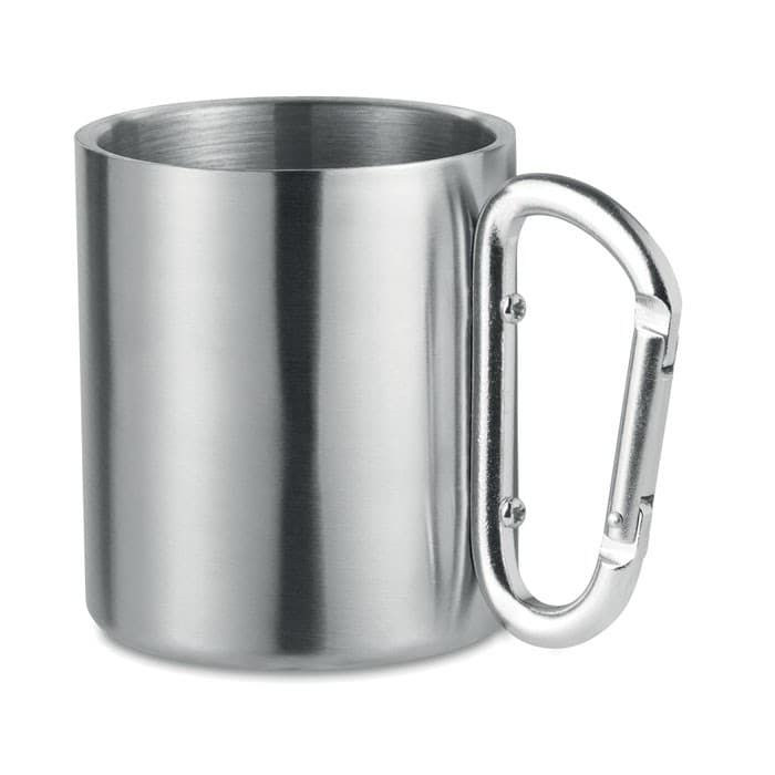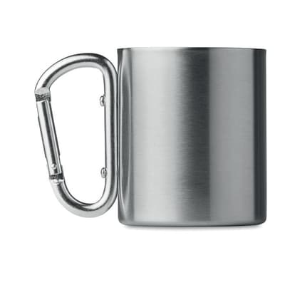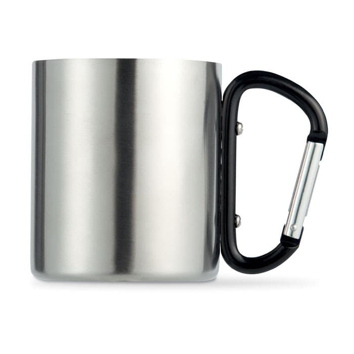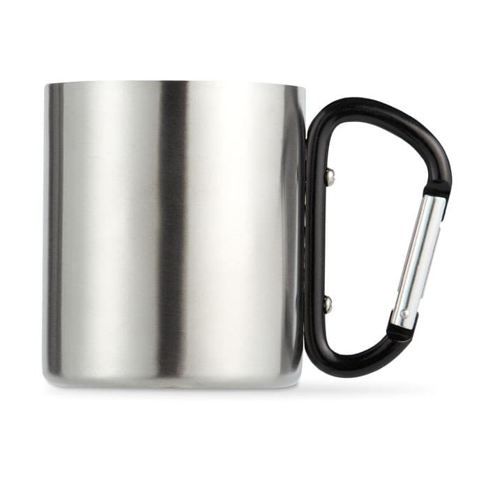 Dubbelwandige, roestvrijstalen mok met een karabijnhaak als handvat. Inhoud: 220 ml.