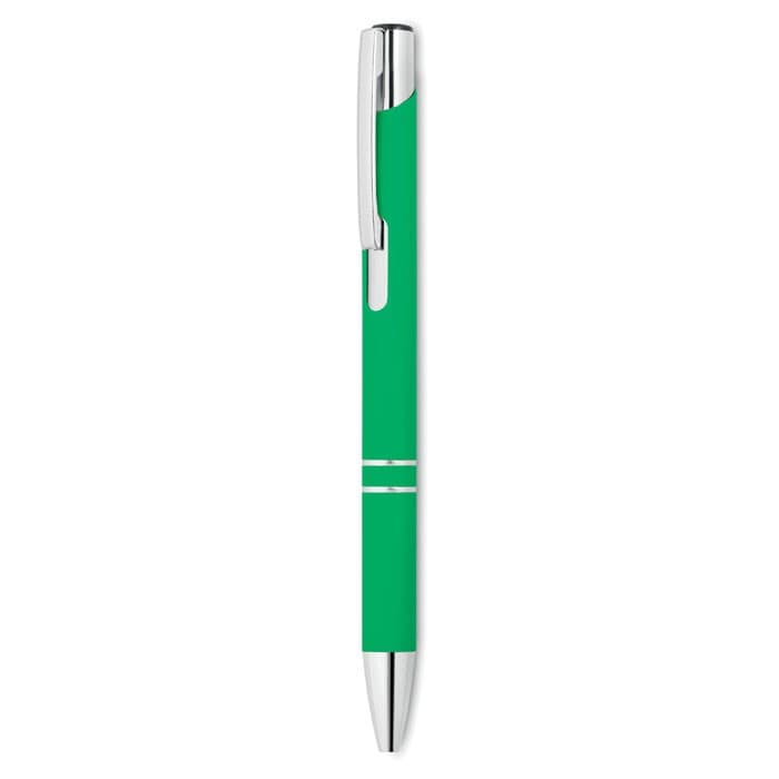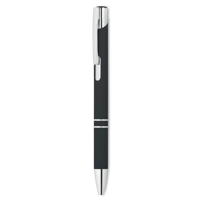 Aluminium balpen met drukmechanisme. Rubberen afwerking. Blauwe inkt.