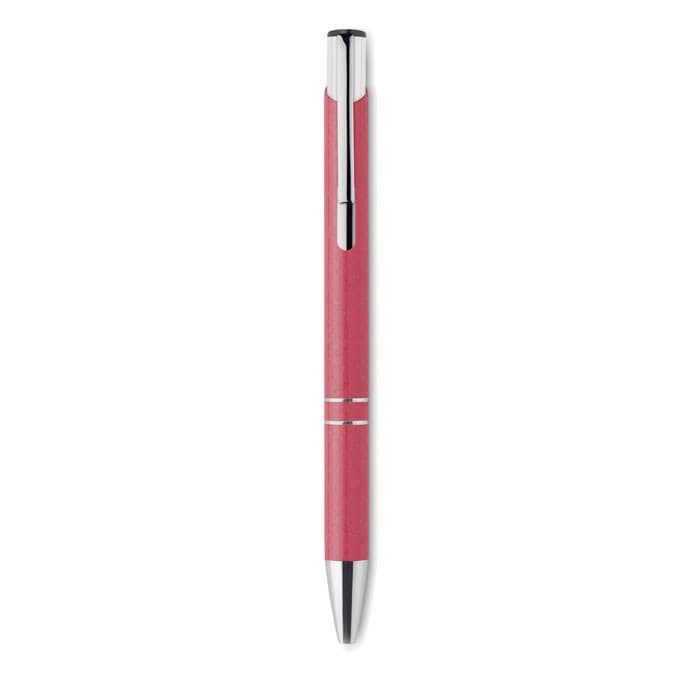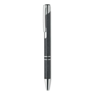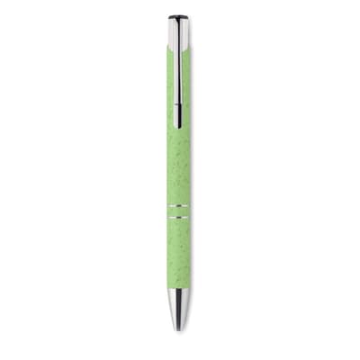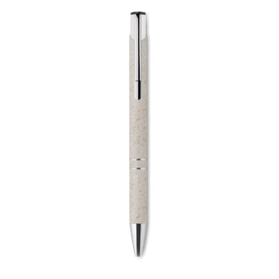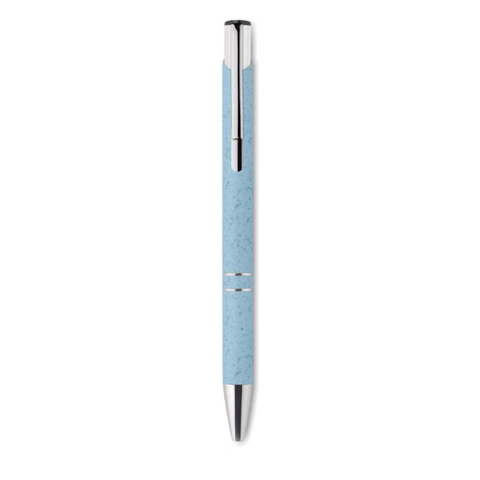 Balpen met drukmechanisme en zilveren details. Behuizing is van 50% tarwestro en 50% ABS-materiaal. Blauwe inkt.