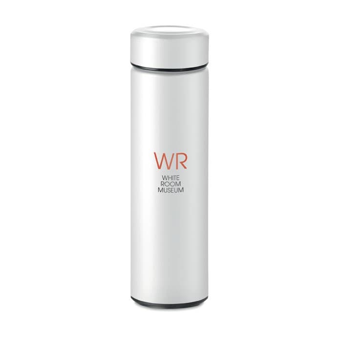 Dubbelwandige RVS fles met vacuüm isolatie en uitneembare theezeef. In de dop zit een geïntegreerde