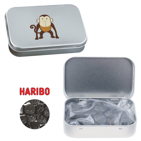 Scharnierblik 95x60x21 mm met ca. 60 gr. Haribo munt drop. Perfect voor snoepgoed bedrukken.