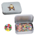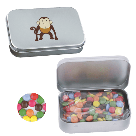 Scharnierblik 95x60x21 mm met ca. 50 gr. chococarletties. Perfect voor snoepgoed bedrukken.