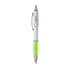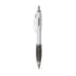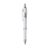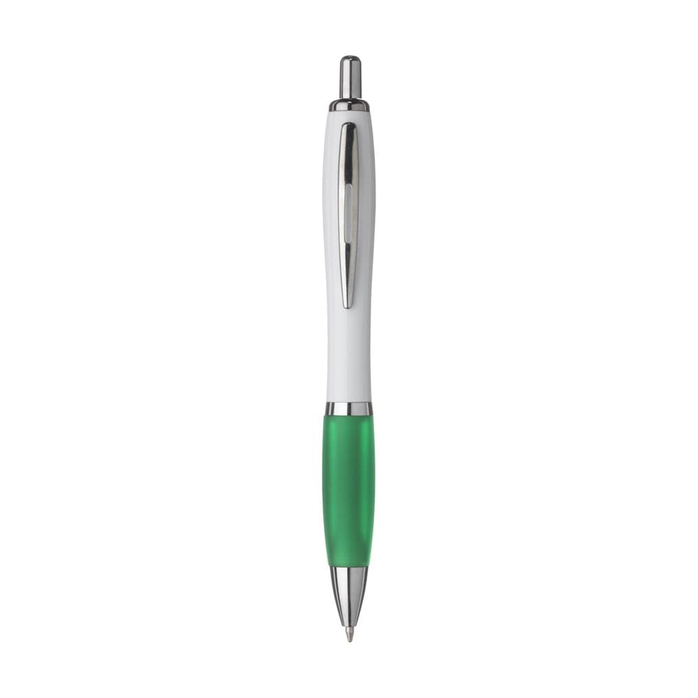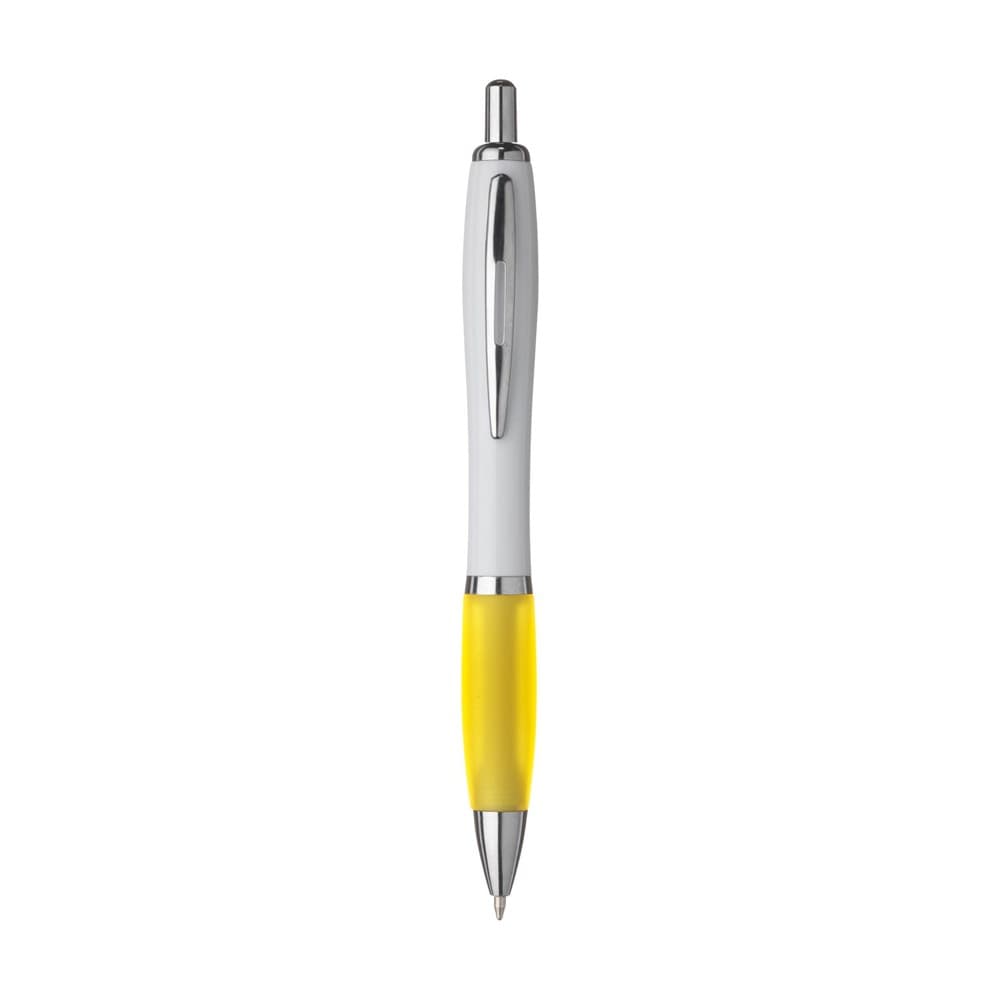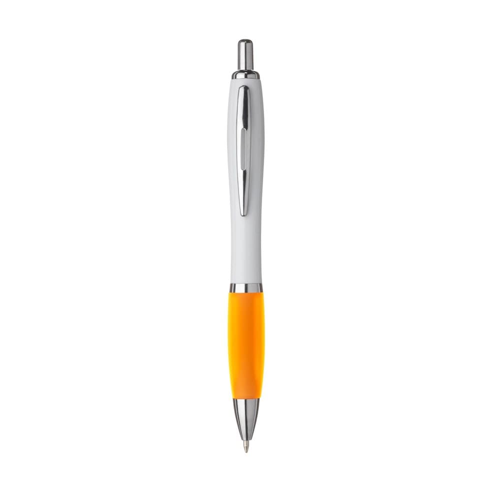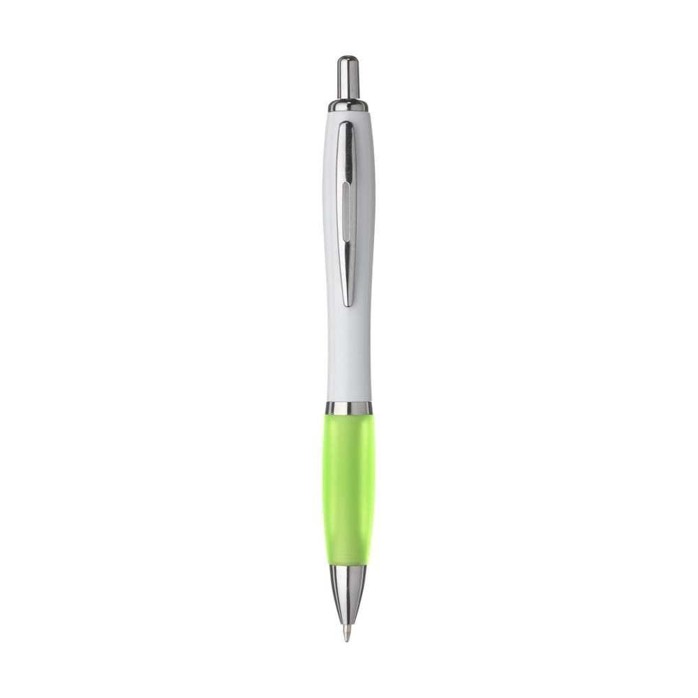Blauwschrijvende óf zwartschrijvende balpen met witte houder met gekleurd, gripvast voorstuk en metalen clip.