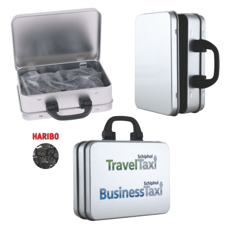 Kofferblik 115x85x34 mm met ca. 150 gr. Haribo muntdrop