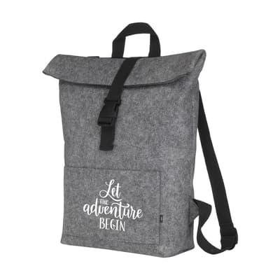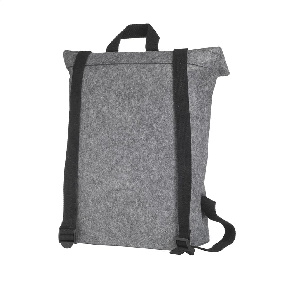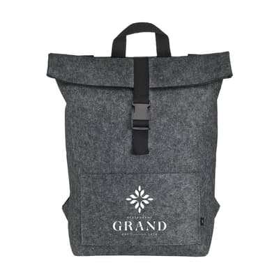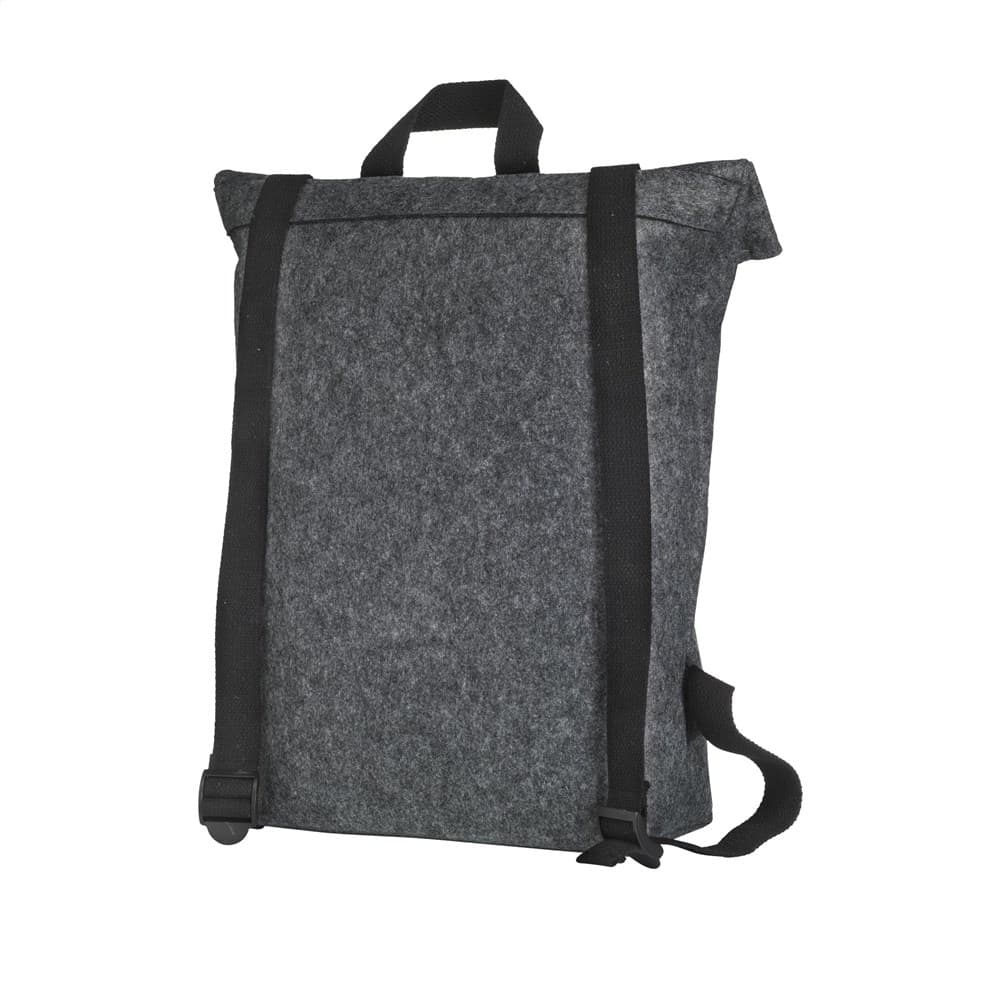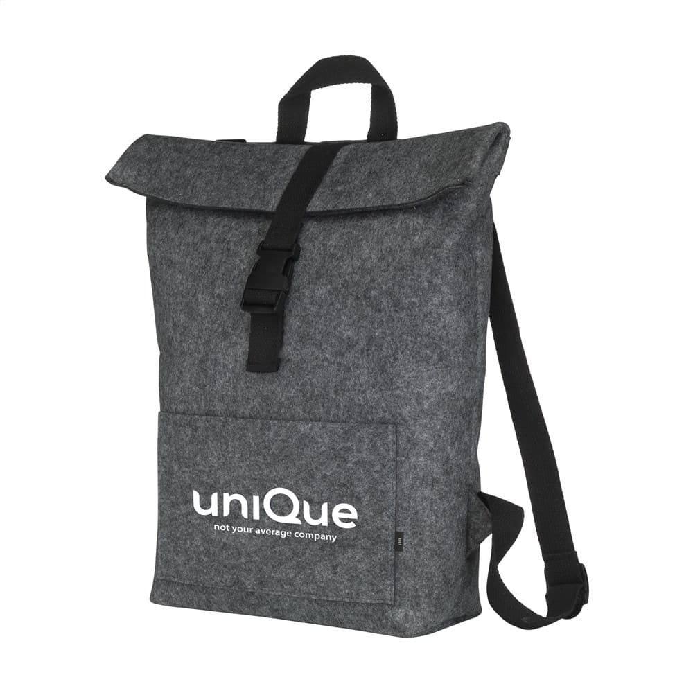 WoW! Stoere, praktische 'roll-top' rugzak van stevig RPET vilt (gemaakt van gerecyclede PET-flessen). De rugzak heeft een ruim binnenvak en een insteekvak aan de voorzijde. Met draaglus, rolsluiting en handig kliksysteem aan de bovenzijde. Inhoud ca. 15 liter.