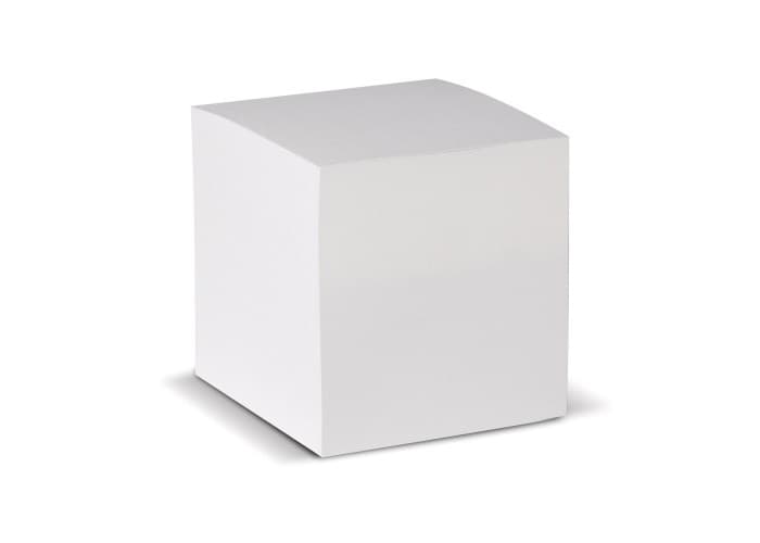 Kubusblok met wit papier. Circa 730 houtvrije vellen van 90g/m². Enkelbladsbedrukking mogelijk. Wordt per stuk geseald.