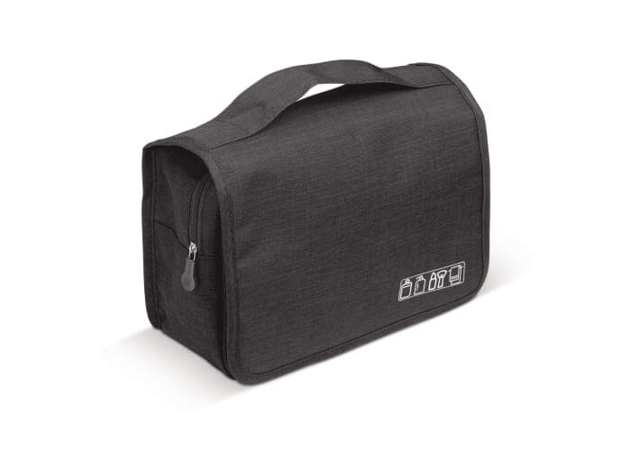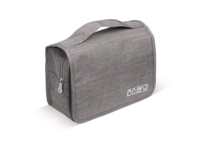 Praktische toilettas voorzien van vakjes en een haak om handig op te hangen.
