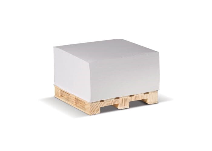 Kubusblok met wit papier op houten pallet. Enkelbladsbedrukking mogelijk. Circa 420 houtvrije vellen van 90g/m². Wordt per stuk geseald.
