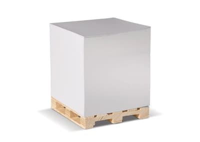 Kubusblok met wit papier op houten pallet. Circa 840 houtvrije vellen. Enkelbladsbedrukking mogelijk. Wordt per stuk geseald. 90g/m².