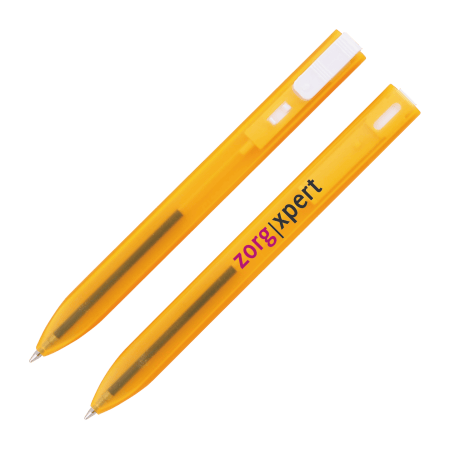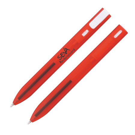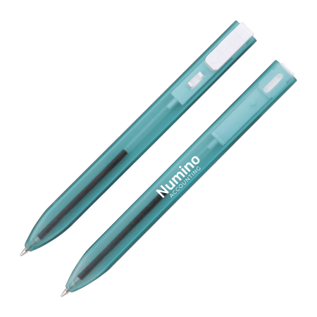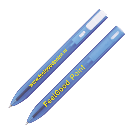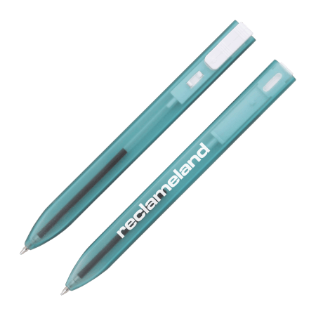 EGINA platte kunststof frosty Peekay balpen in diverse kleuren, met witte clip en drukker en met blauwschrijvende kunststofvulling