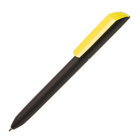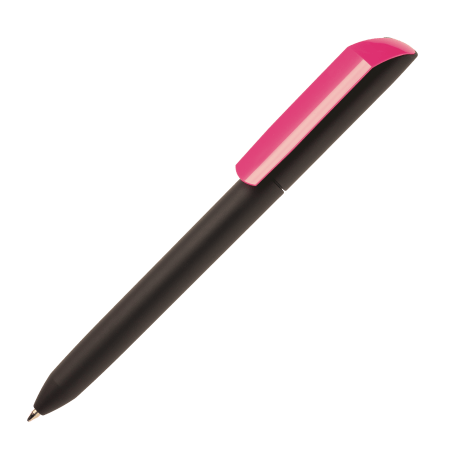 Maxema balpen FLOW PURE F2P GOM KF, draaibalpen met zwarte houder en bovenstuk voorzien van rubber coating, glanzende transparante clip in fluor kleuren. Voorzien van Jumbo vulling met blauwe Dokumental inkt voor tot 2.500 meter schrijfplezier. Leverbaar in maar liefst 5 kleuren welke vanaf 2.000 stuks onderling qua kleur gecombineerd kunnen worden.