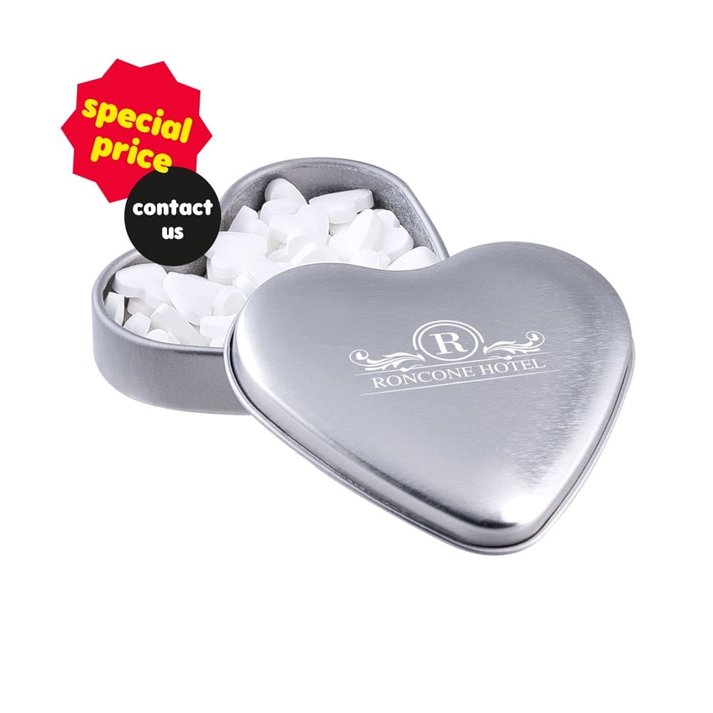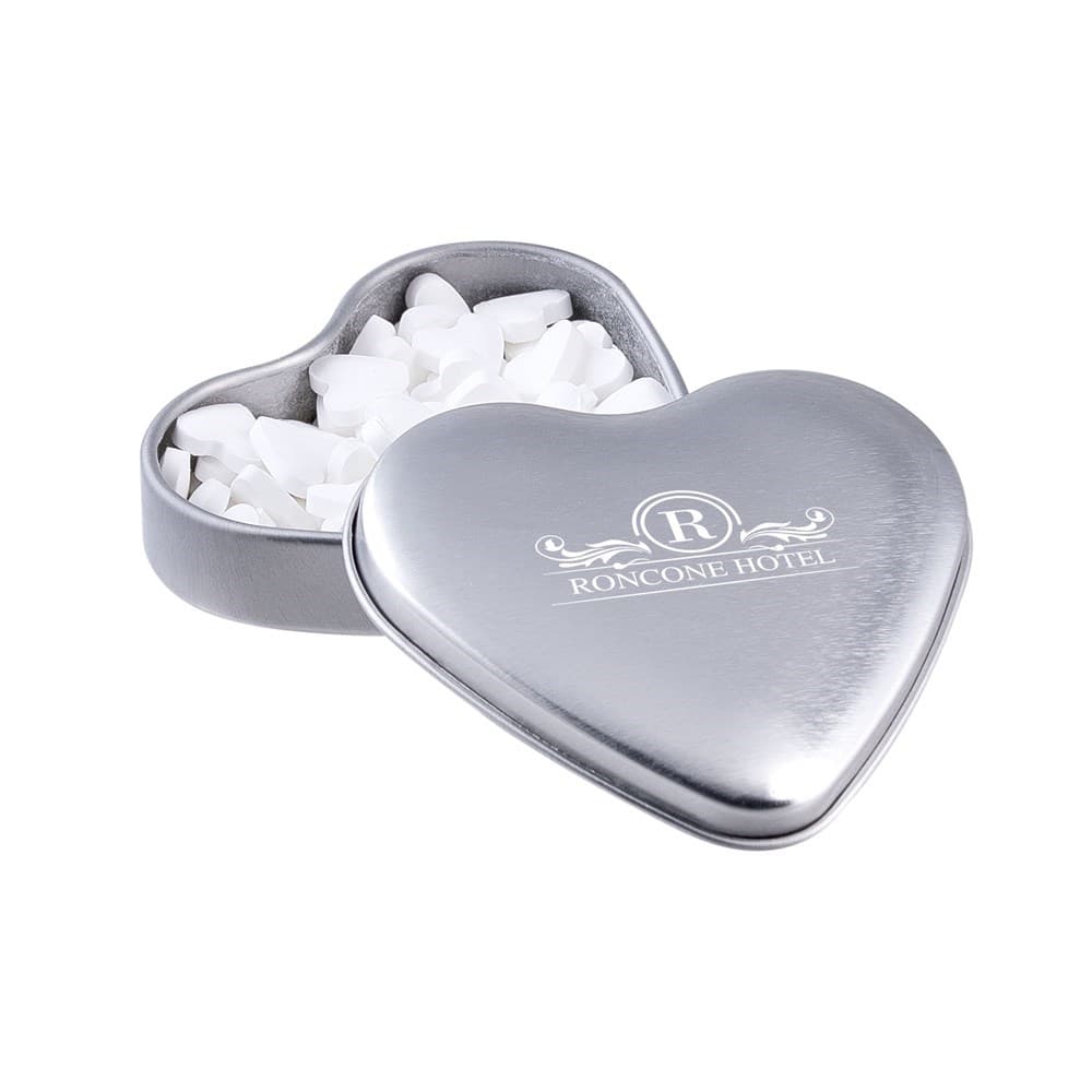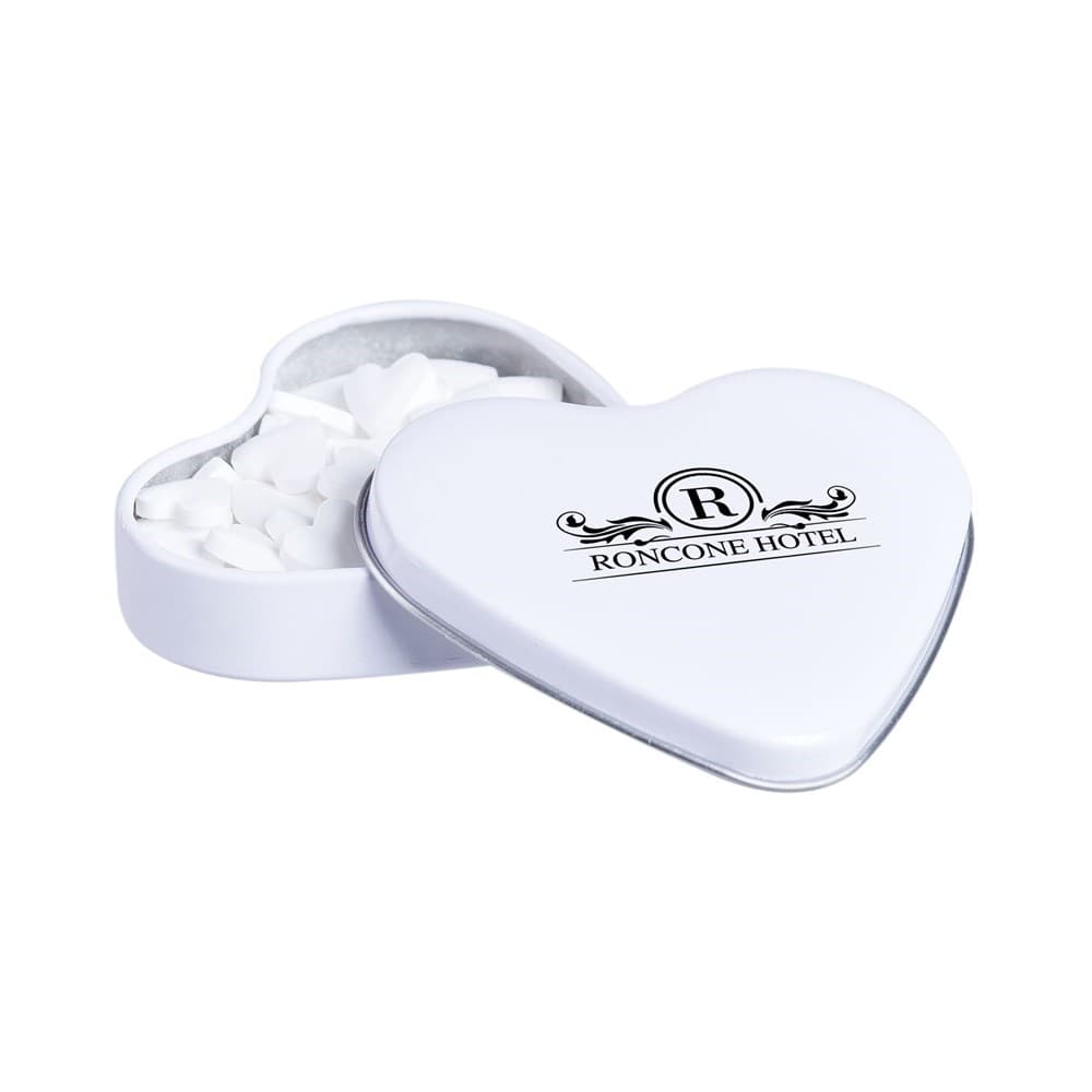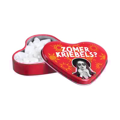 Hartenblikje wit met ca. 23 gram hartjes pepermunt en voorzien van een full colour bedrukking. Inclusief ingrediëntensticker en seal.