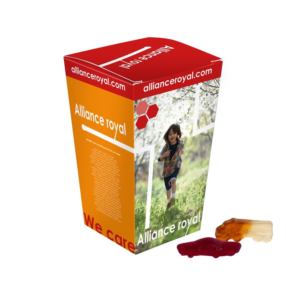 Full colour bedrukt doosje voor in de autobekerhouder, gevuld met ca. 170 gram Autodrop