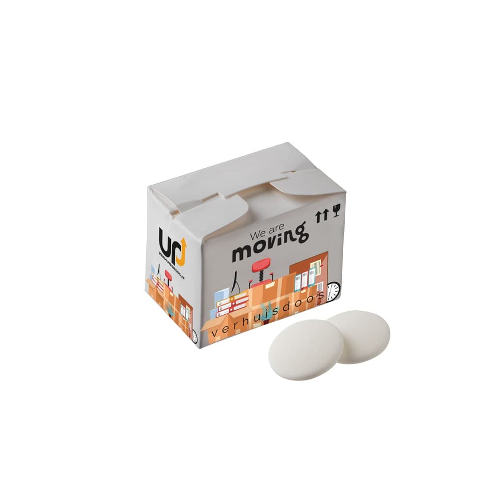 Full colour bedrukt doosje, opgemaakt als verhuisdoosje en gevuld met snoep