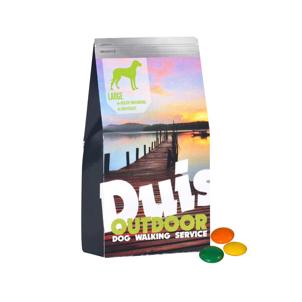 Voerzakje all-over full colour bedrukt, gevuld met ca. 25 gram mini choco's. Andere vullingen zijn op aanvraag leverbaar.