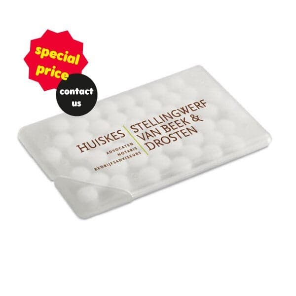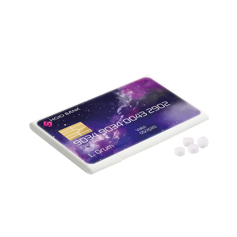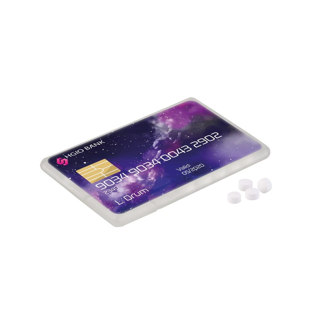 Transparante mint creditcard voorzien van een full colour bedrukking op de bovenzijde, gevuld met ca. 8 gram suikervrije pepermuntjes