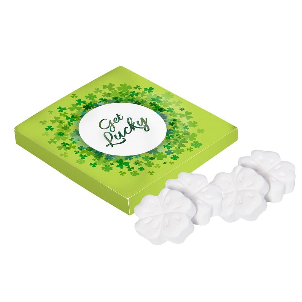 Vierkant doosje all-over full colour bedrukt, gevuld met 4 pepermuntjes in de vorm van een klavertje vier