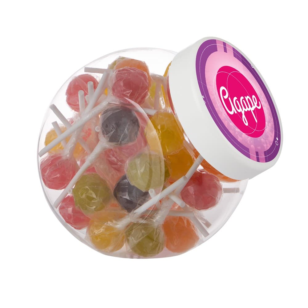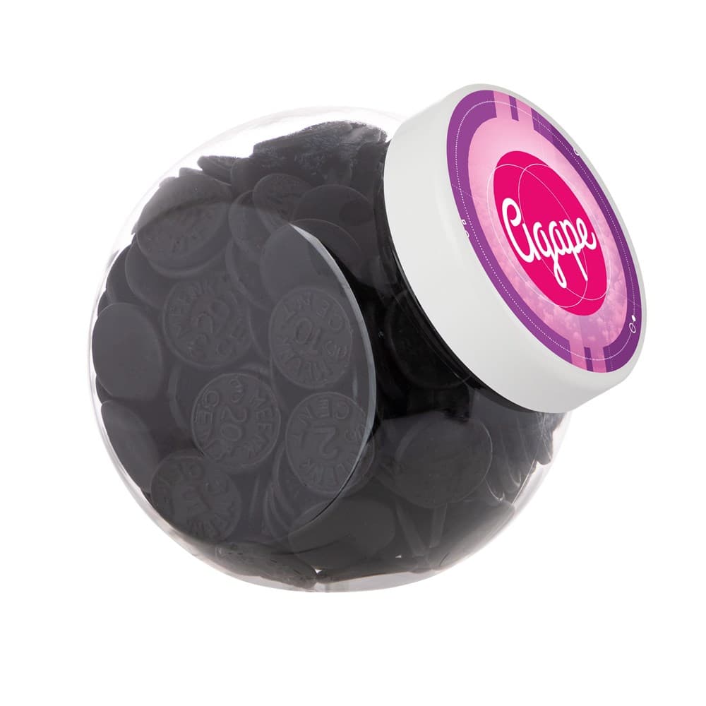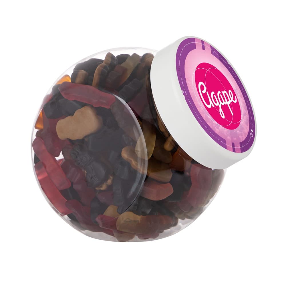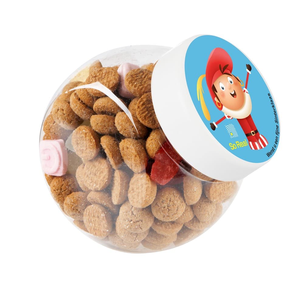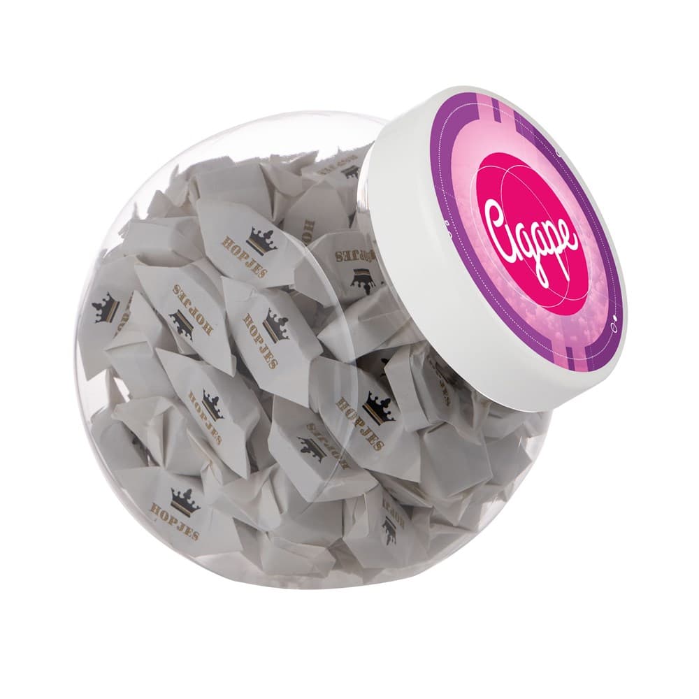 Plastic pot 1 liter met wit deksel gevuld met dropstaafjes en voorzien van een full colour sticker op het deksel