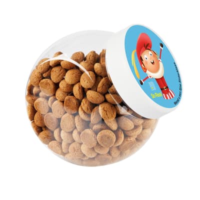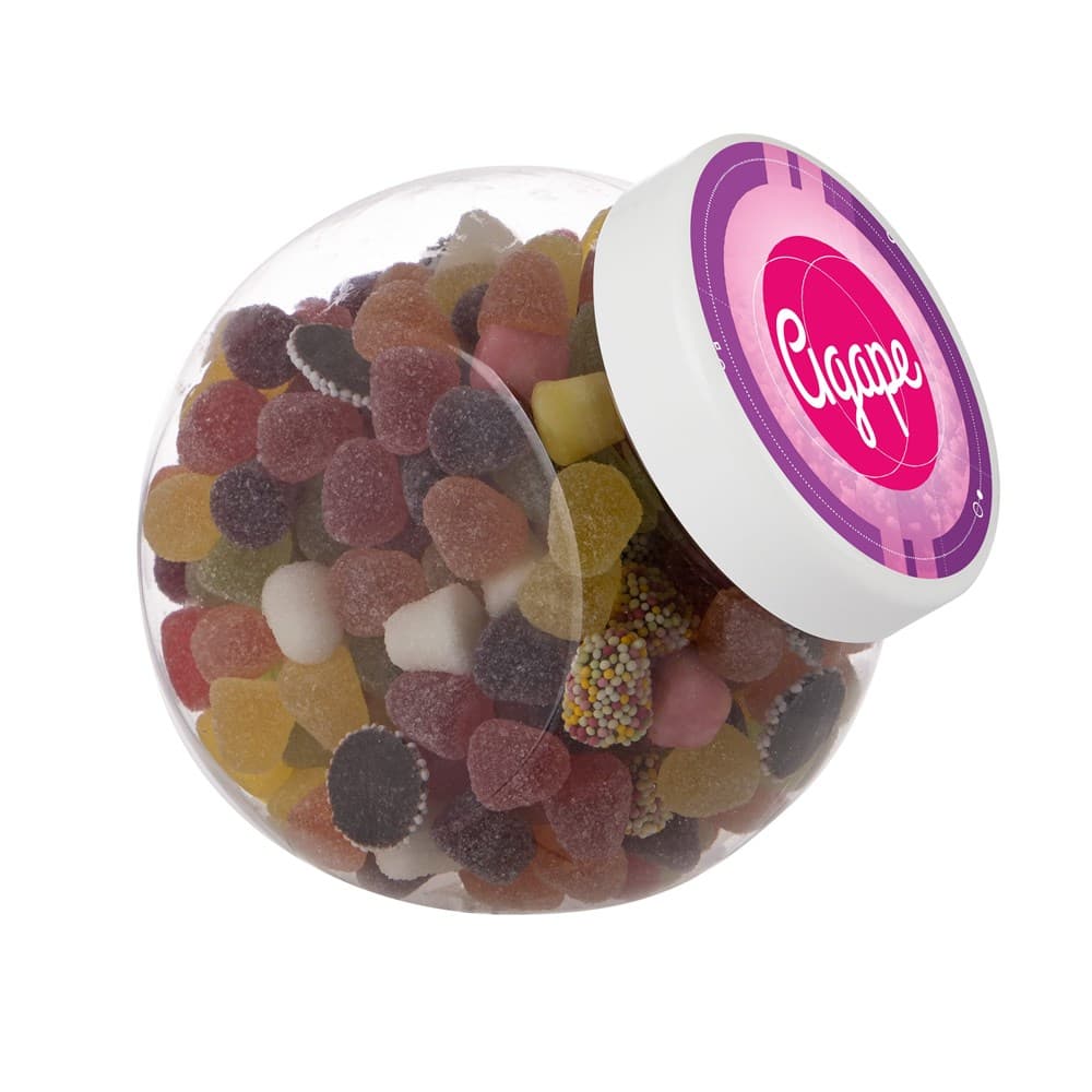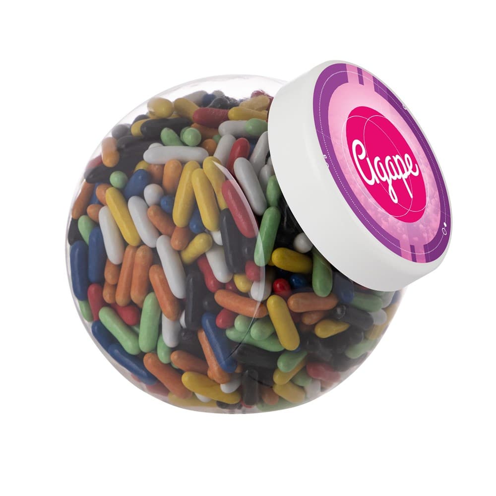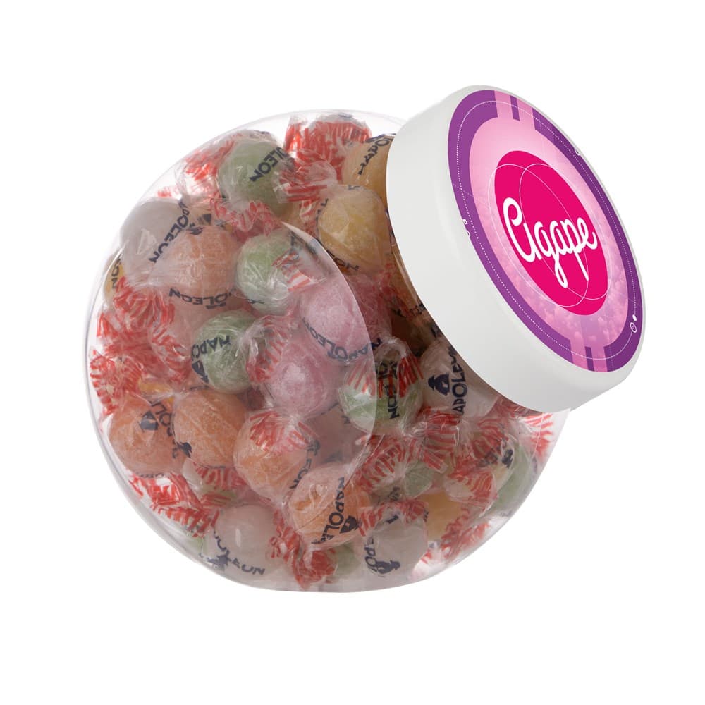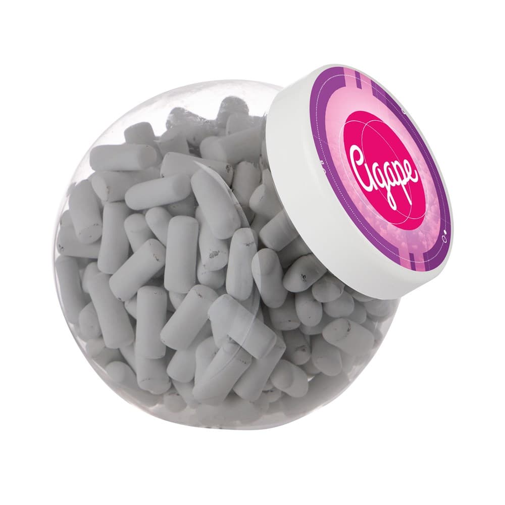 Plastic pot 1 liter met wit deksel gevuld met dropstaafjes en voorzien van een full colour sticker op het deksel