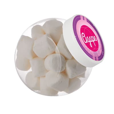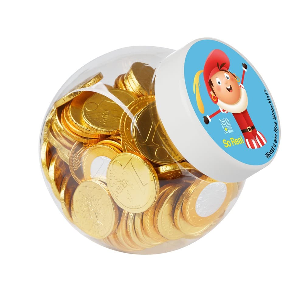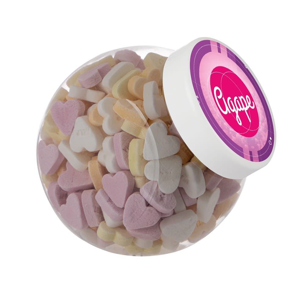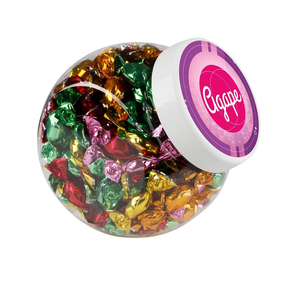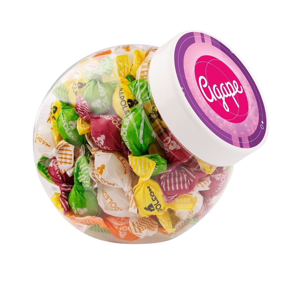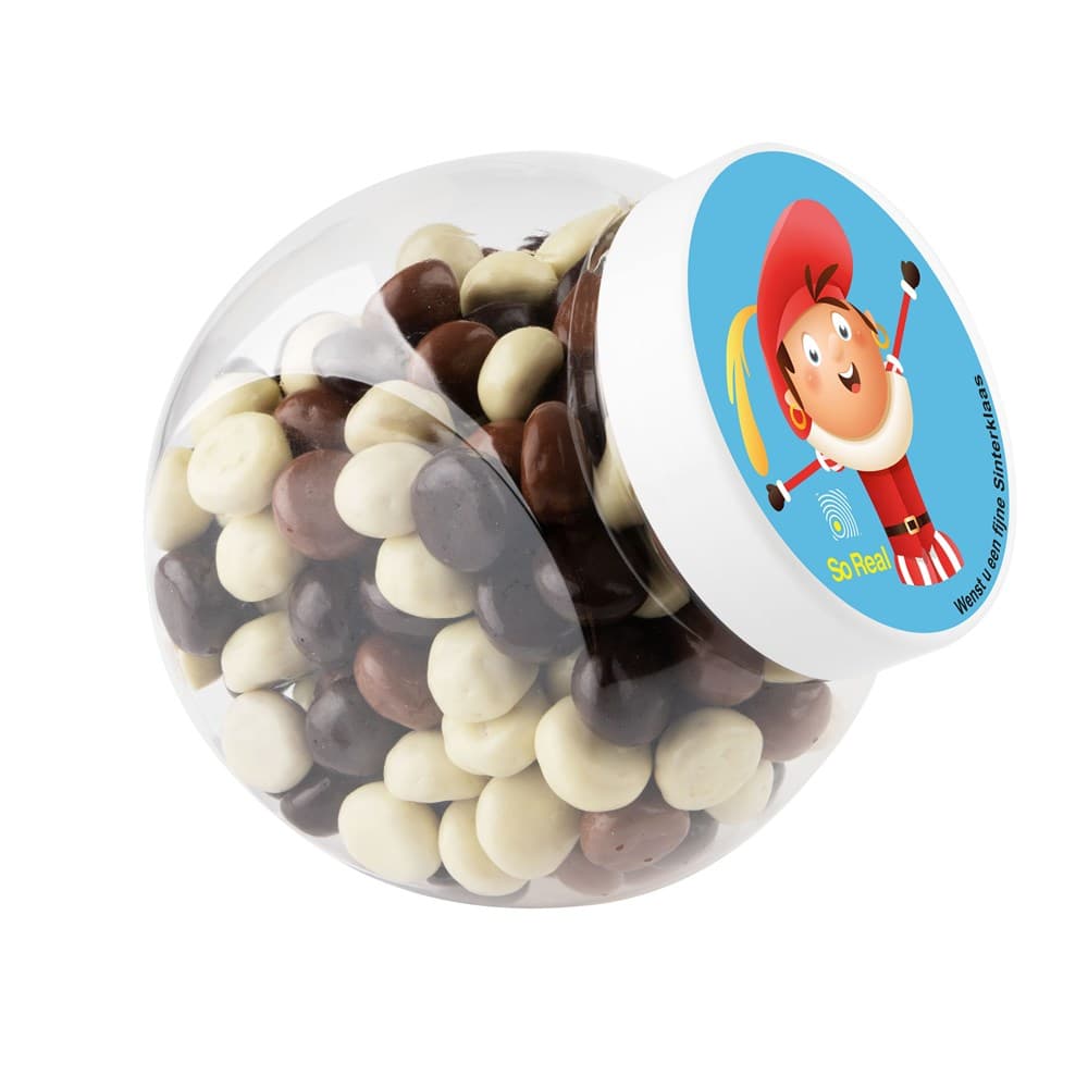 Plastic pot 1 liter met wit deksel gevuld met dropstaafjes en voorzien van een full colour sticker op het deksel