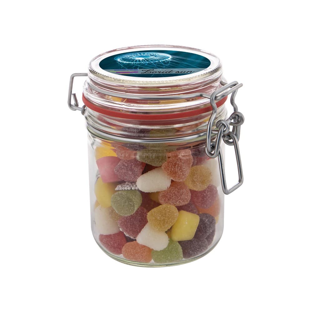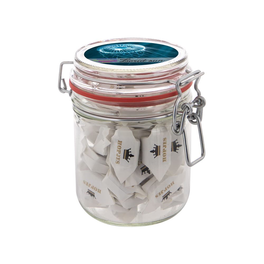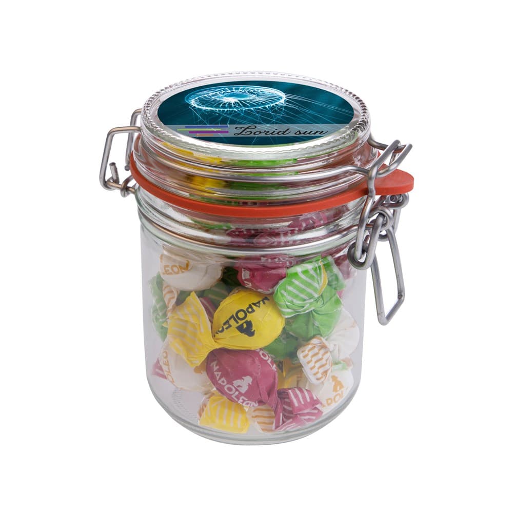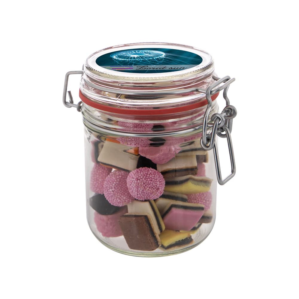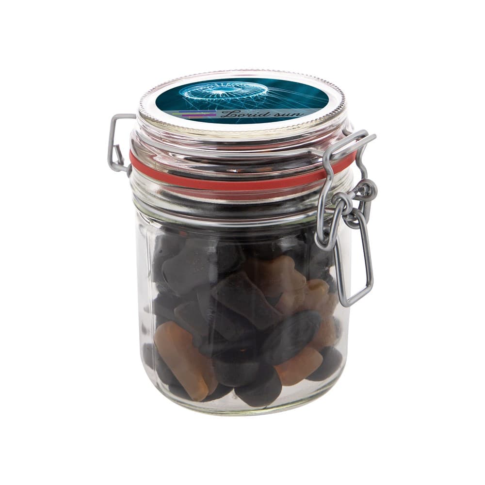Weckpotje 0,4 liter gevuld met dropstaafjes en voorzien van een full colour sticker op het deksel