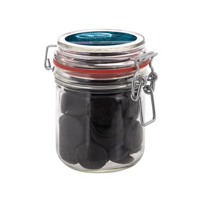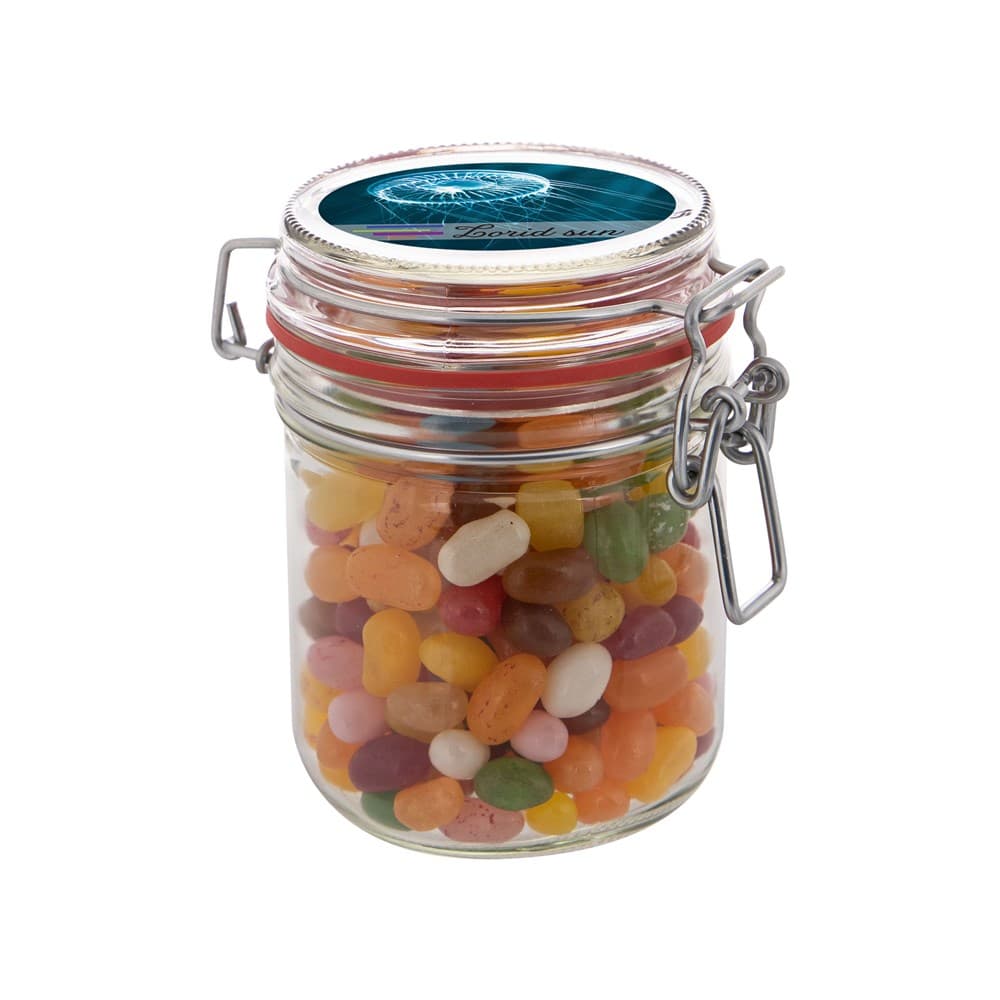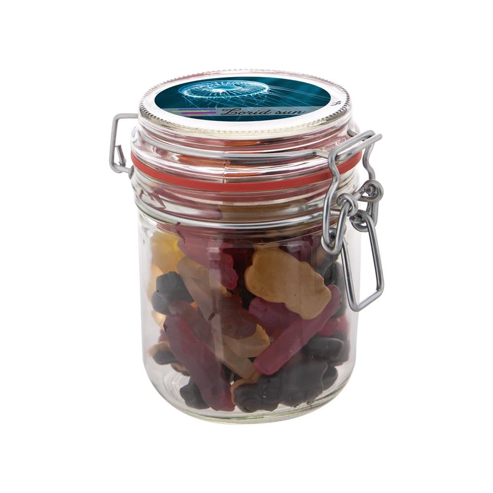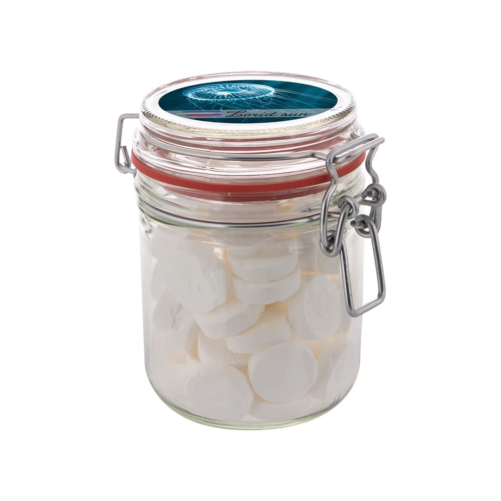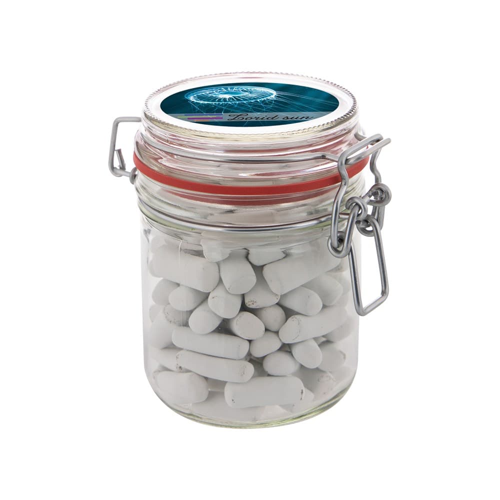 Weckpotje 0,4 liter gevuld met dropstaafjes en voorzien van een full colour sticker op het deksel