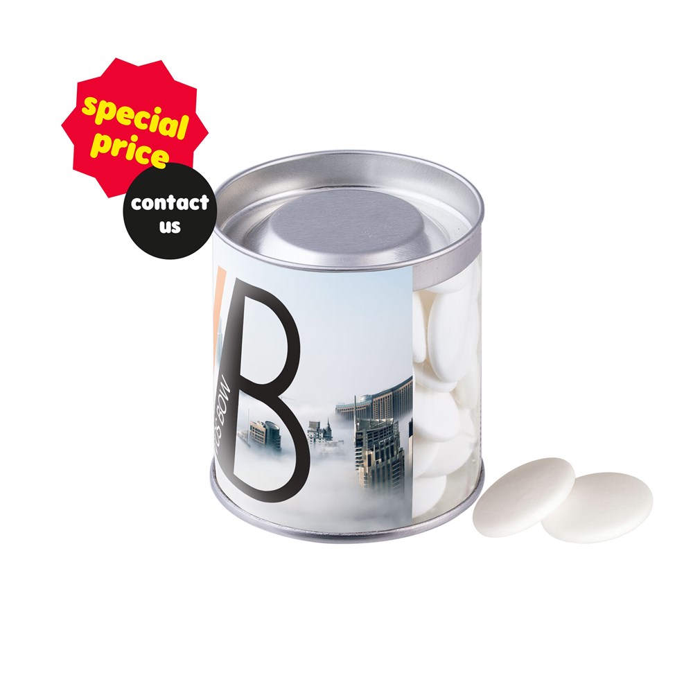 Transparante can voorzien van een full colour bedrukte inlay, gevuld met ca. 130 gram imperiale pepermunt