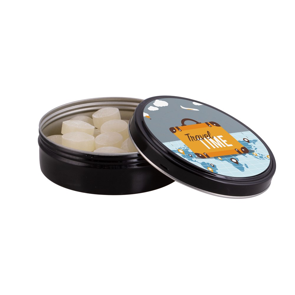 Zwart blikje gevuld met ca. 60 gr. vruchtenzuurtjes, voorzien van een full colour bedrukking op het deksel. Inclusief ingrediëntensticker en seal.