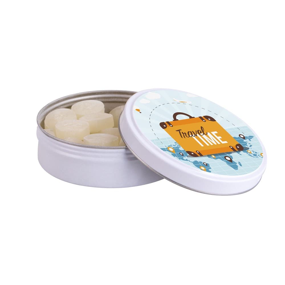 Zwart blikje gevuld met ca. 60 gr. vruchtenzuurtjes, voorzien van een full colour bedrukking op het deksel. Inclusief ingrediëntensticker en seal.